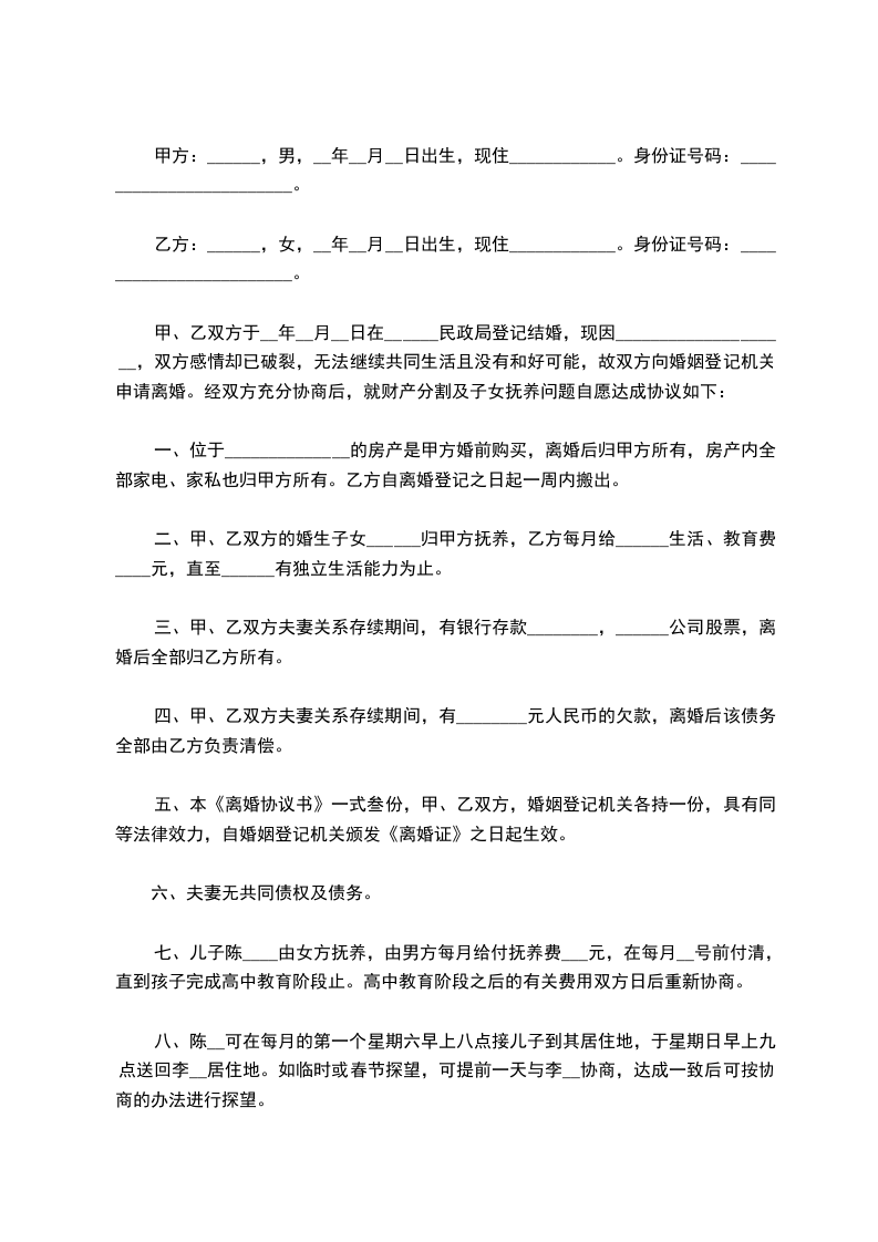 七、儿子陈____由女方抚养,由男方每月给付抚养费___元,在每月__号前付清,直到孩子完成高中教育阶段止。高中教育阶段之后的有关费用双方日后重新协商。
