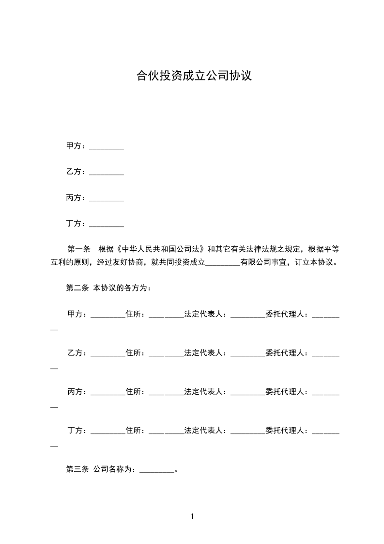 第一条 根据《中华人民共和国公司法》和其它有关法律法规之规定,根据平等互利的原则,经过友好协商,就共同投资成立_________有限公司事宜,订立本协议。