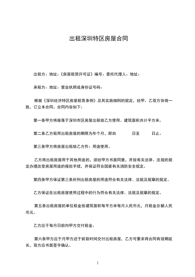 第一条甲方将座落于深圳市区房屋出租给乙方使用。建筑面积共计平方米。