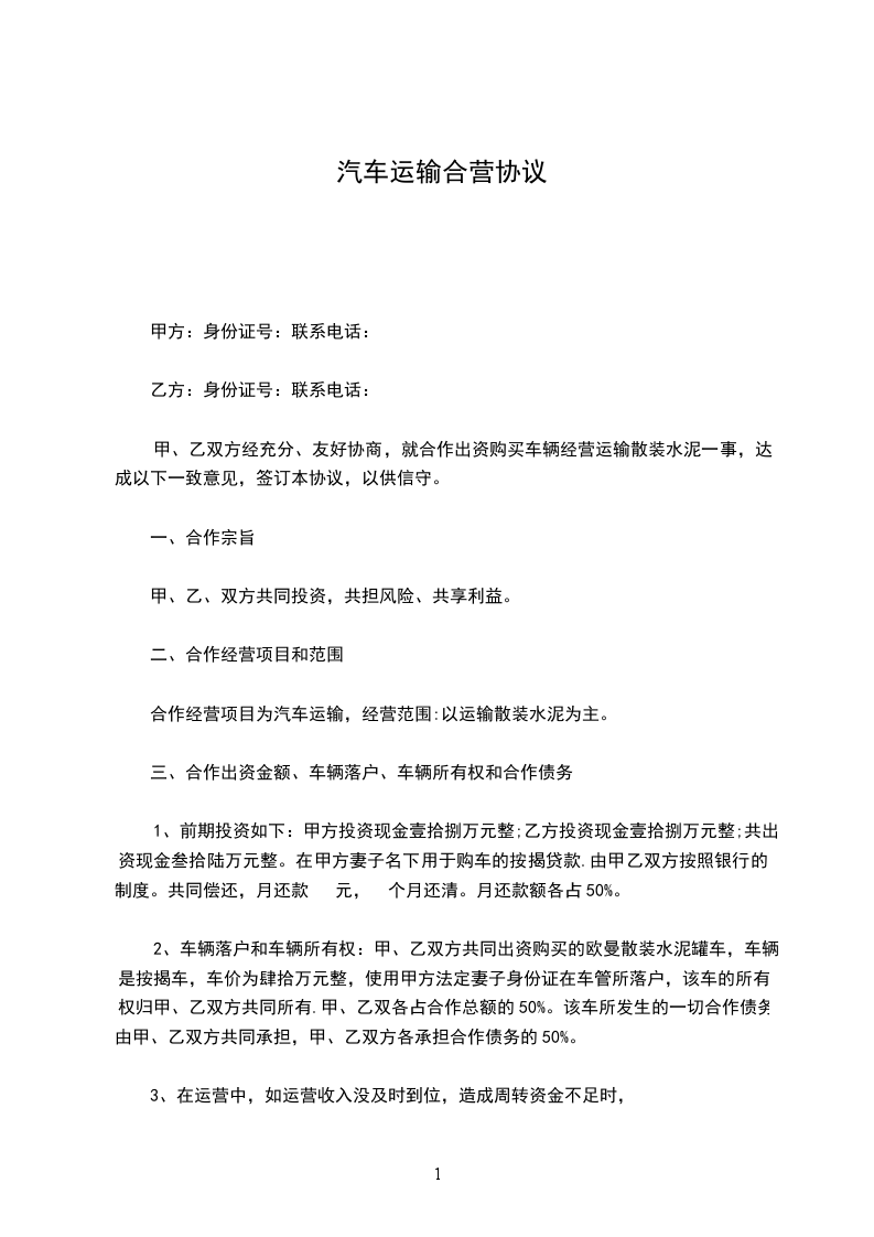 甲、乙双方经充分、友好协商,就合作出资购买车辆经营运输散装水泥一事,达成以下一致意见,签订本协议,以供信守。