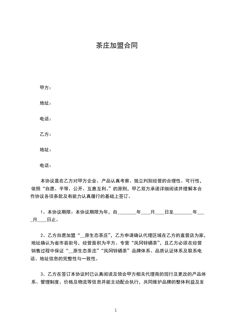 2、乙方自愿加盟“__原生态茶庄”,乙方申请确认代理区域在乙方的直营店为家,地址确认为省市县街号,经营面积为平方。专营“凤冈锌硒茶”,且乙方必须在经营销售过程中保证“__原生态茶庄”“凤冈锌硒茶”品牌体系、品质认证体系及联系电话、地址信息的完整性与一致性。