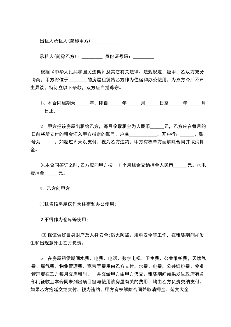 根据《中华人民共和国民法典》及其它有关法律、法规规定,经甲,乙双方充分协商,甲方将位于________的房屋租赁给乙方作为住宿和办公使用,为双方今后不产生异议,特订立以下条款,双方应自觉尊守。