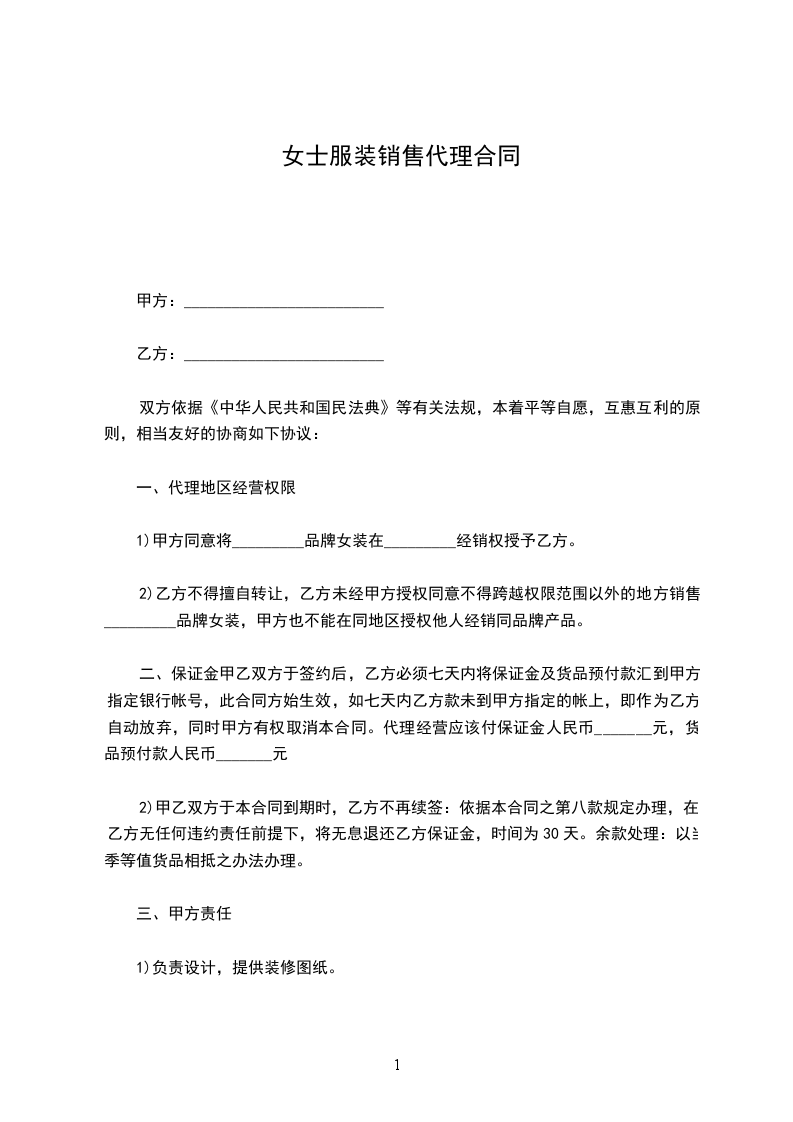 2)乙方不得擅自转让,乙方未经甲方授权同意不得跨越权限范围以外的地方销售_________品牌女装,甲方也不能在同地区授权他人经销同品牌产品。