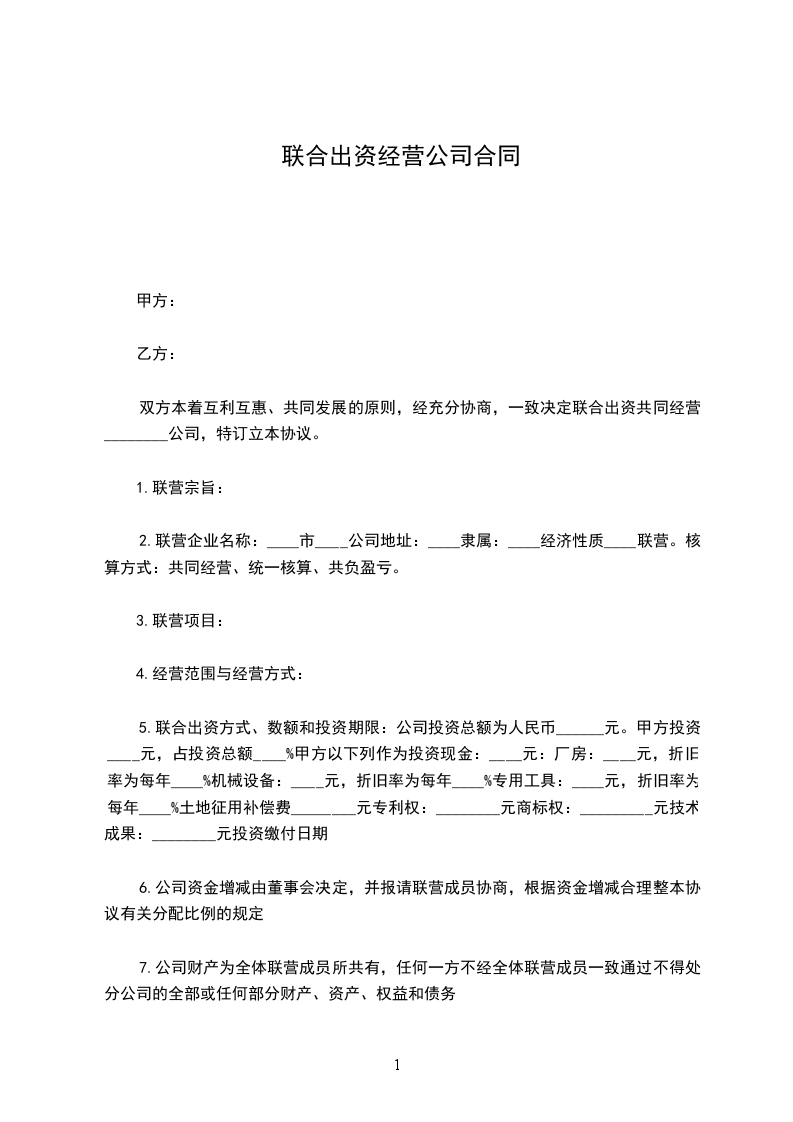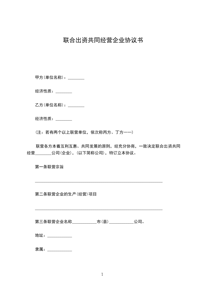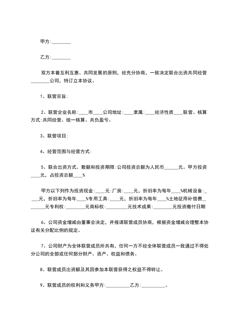 双方本着互利互惠、共同发展的原则,经充分协商,一致决定联合出资共同经营________公司,特订立本协议。