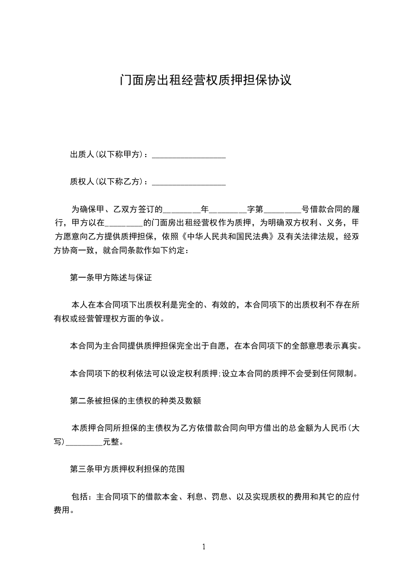 为确保甲、乙双方签订的_________年_________字第_________号借款合同的履行,甲方以在_________的门面房出租经营权作为质押,为明确双方权利、义务,甲方愿意向乙方提供质押担保,依照《中华人民共和国民法典》及有关法律法规,经双方协商一致,就合同条款作如下约定: