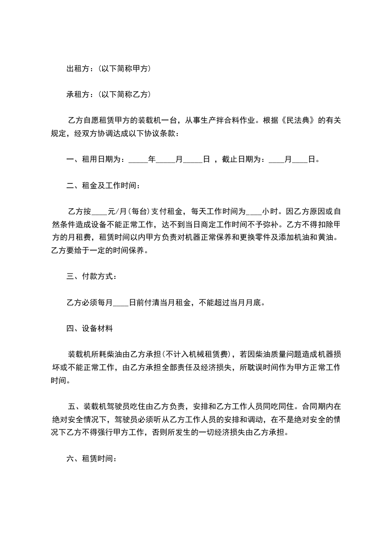 乙方自愿租赁甲方的装载机一台,从事生产拌合料作业。根据《民法典》的有关规定,经双方协调达成以下协议条款: