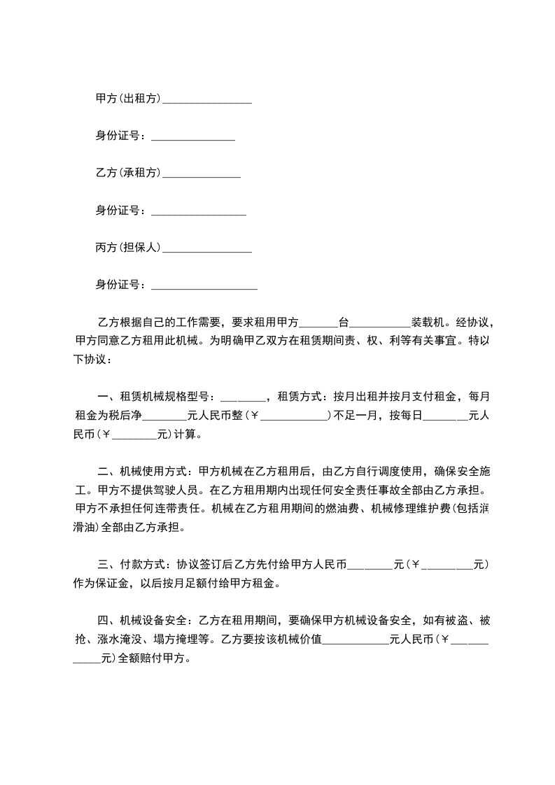 九、合同期内装载机被盗或其它任何外界条件的影响对装载机不利的情况都由乙方承担责任。