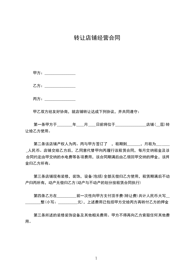 一、丙方同意甲方将自己位于___街___(路)___号的店铺(原为:___)转让给乙方使用,建筑面积为___平方米;并保证乙方同等享有甲方在原有房屋租赁合同中所享有的权利与义务。