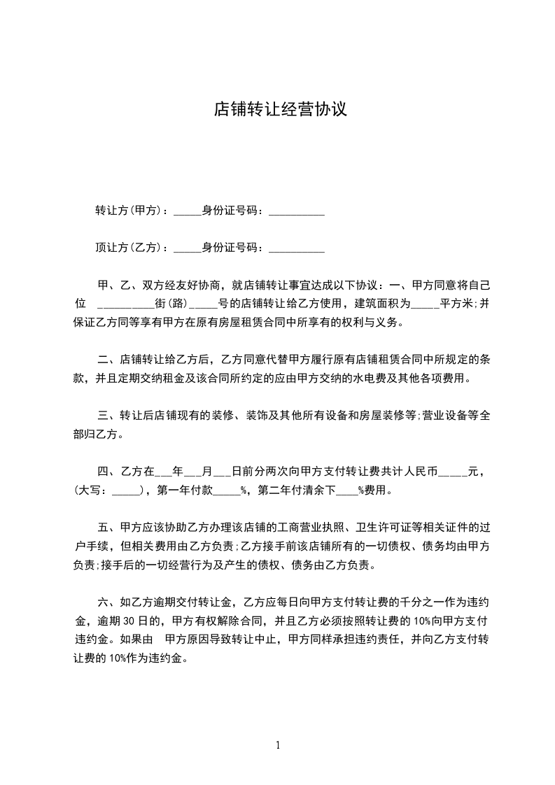八、如果合同签订前政府已下令拆迁店铺,甲方退偿全部转让费,赔还乙方接手该店铺的装修损失费,并支付转让费的10%的违约金。如果合同签订之后政府明令拆迁店铺,或者市政建设(如修、扩路、建天桥、立交桥、修地铁等)导致乙方难以经营,乙方有权解除合同,甲方退还剩余租期的转让费,押金仍归乙方(前述顺延除外)。或甲方在每年营业执照有效期届满时仍未办妥年审手续,乙方有权解除合同,甲方应退回全部转让费,赔偿装修、添置设备损失费,并支付转让费的10%的违约金。