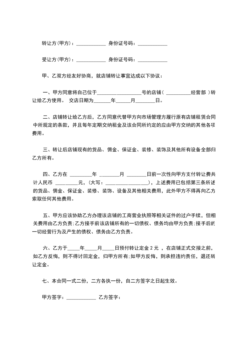 四、乙方在_______年_______月_______日前一次性向甲方支付顶手费(转让费)共计人民币大写___元,上述费用已包括甲方交给丙方再转付乙方的押金、第三条所述的装修装饰设备及其他相关费用。甲方不得再向乙方索取任何其他费用。
