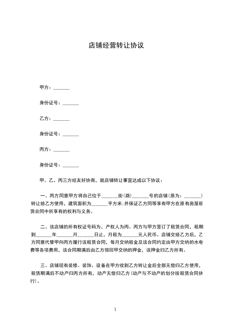 甲、乙、丙三方经友好协商,就店铺转让事宜达成以下协议: