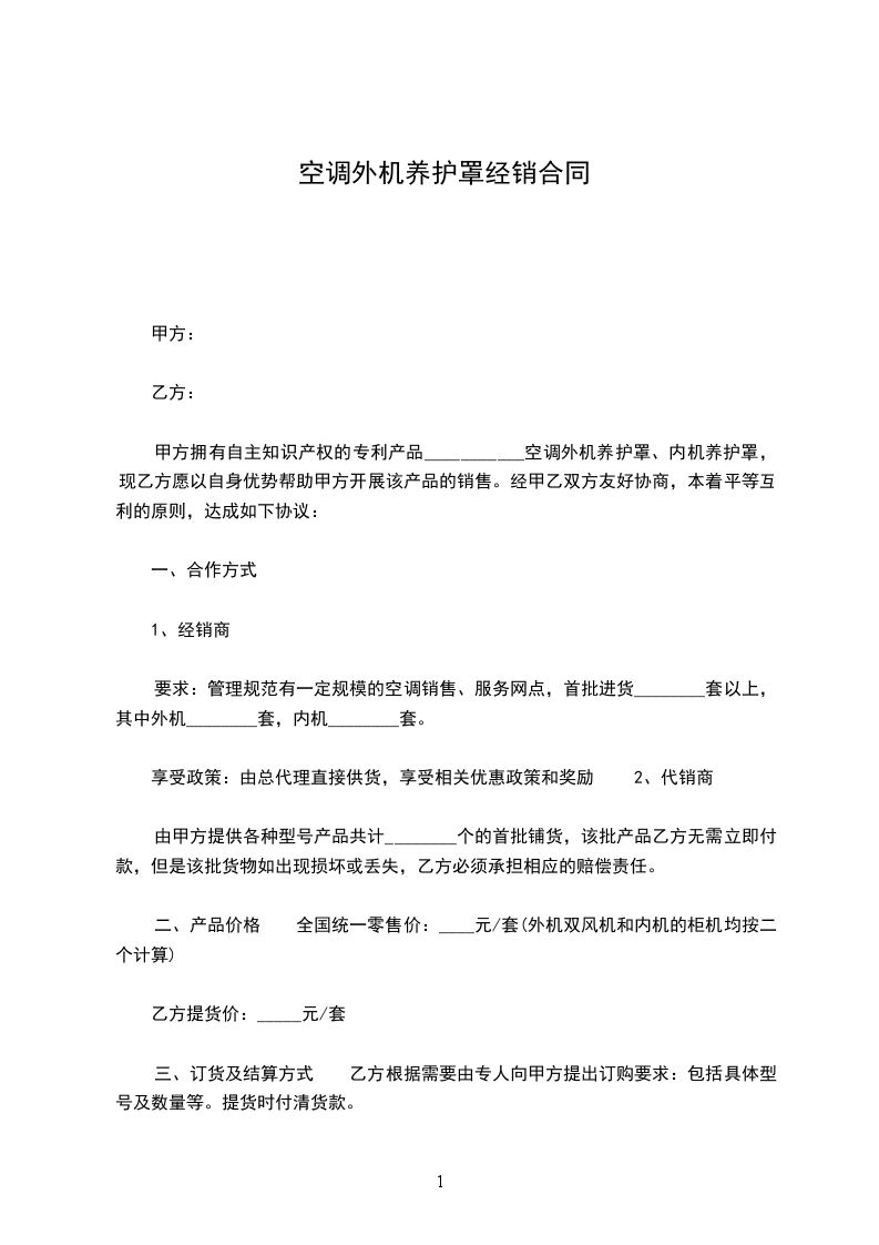 甲方拥有自主知识产权的专利产品___________空调外机养护罩、内机养护罩,现乙方愿以自身优势帮助甲方开展该产品的销售。经甲乙双方友好协商,本着平等互利的原则,达成如下协议: