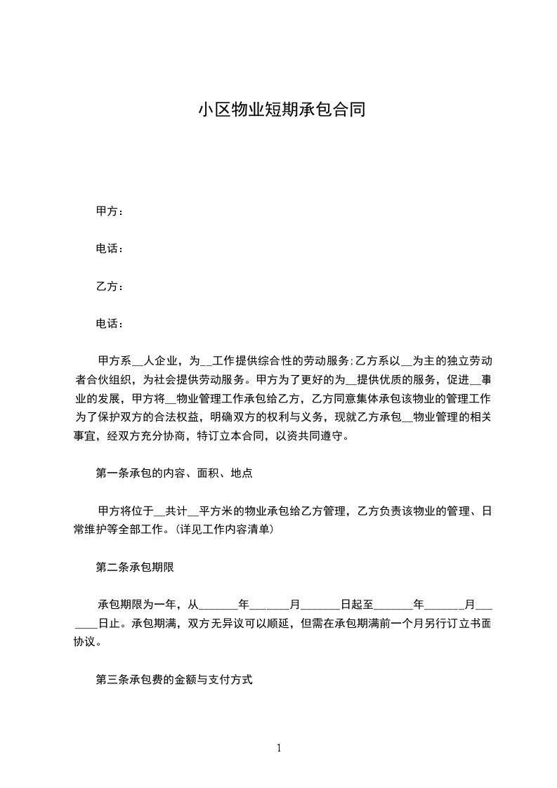 承包期限为一年,从_______年_______月_______日起至_______年_______月_______日止。承包期满,双方无异议可以顺延,但需在承包期满前一个月另行订立书面协议。