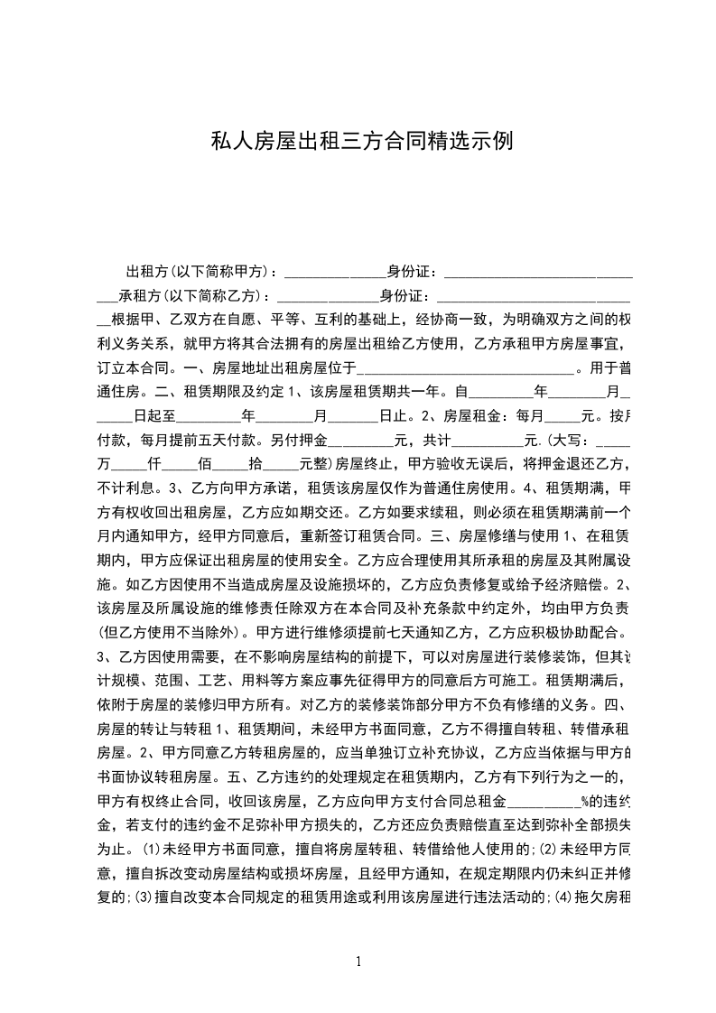 四、租房押金:乙方应于签约同时付给甲方押金__________元,到期结算,多余归还。