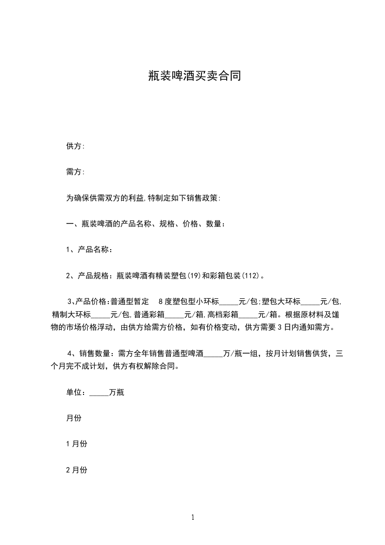 4、销售数量:需方全年销售普通型啤酒_____万/瓶一组,按月计划销售供货,三个月完不成计划,供方有权解除合同。