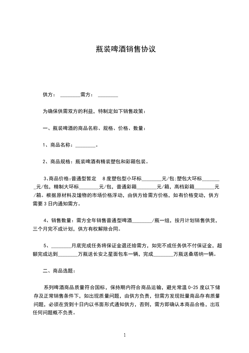 5、12月底完成任务将保证金退还给需方,如完不成任务供不付保证金,超额完成达到_____万瓶送长安之星面包车一辆,完成_____万瓶送桑塔纳一辆。
