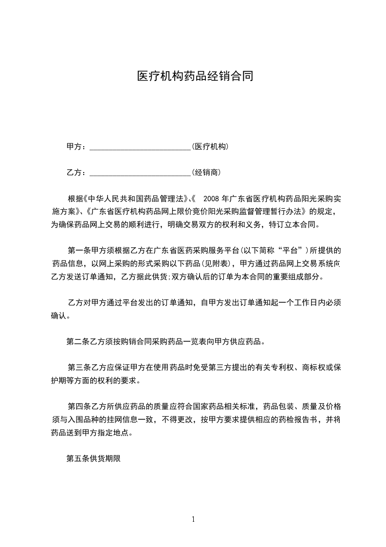 根据《中华人民共和国药品管理法》、《2008年广东省医疗机构药品阳光采购实施方案》、《广东省医疗机构药品网上限价竞价阳光采购监督管理暂行办法》的规定,为确保药品网上交易的顺利进行,明确交易双方的权利和义务,特订立本合同。
