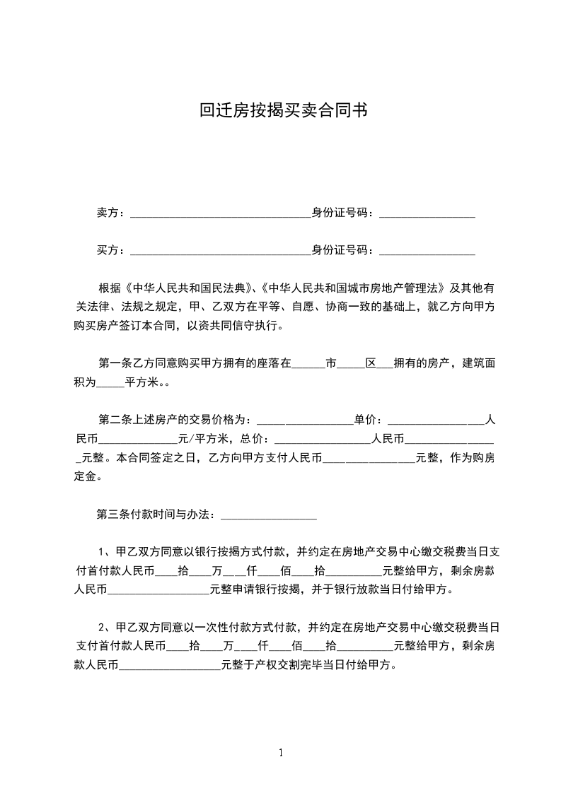 1、甲乙双方同意以银行按揭方式付款,并约定在房地产交易中心缴交税费当日支付首付款人民币____拾____万____仟____佰____拾__________元整给甲方,剩余房款人民币__________________元整申请银行按揭,并于银行放款当日付给甲方。