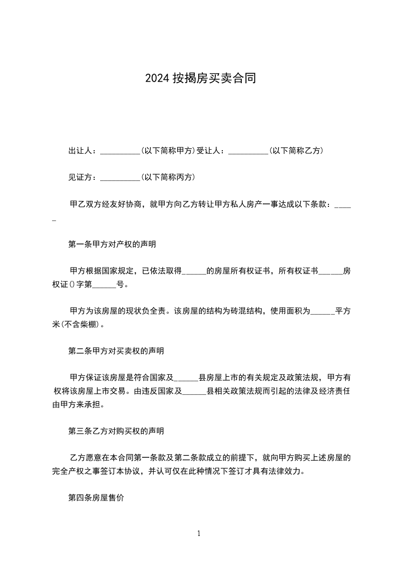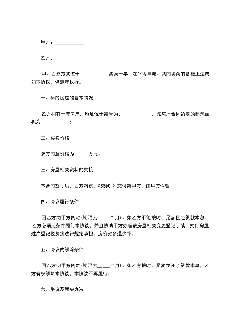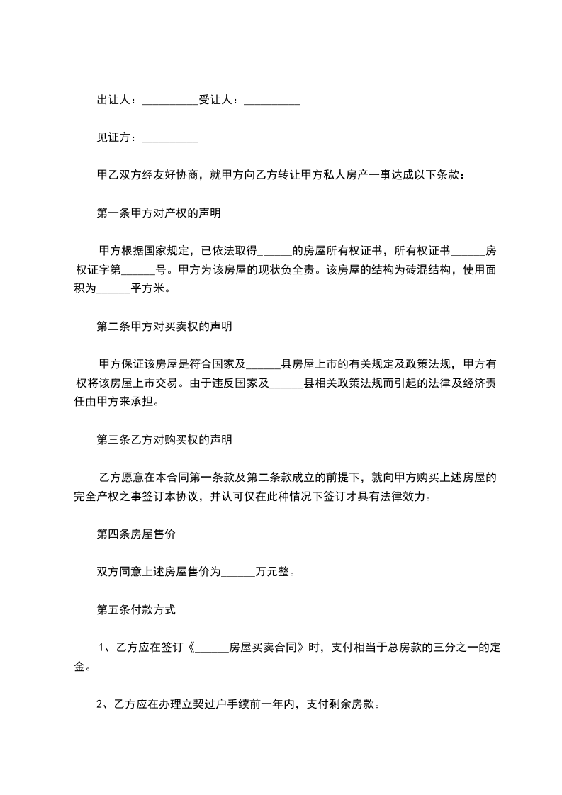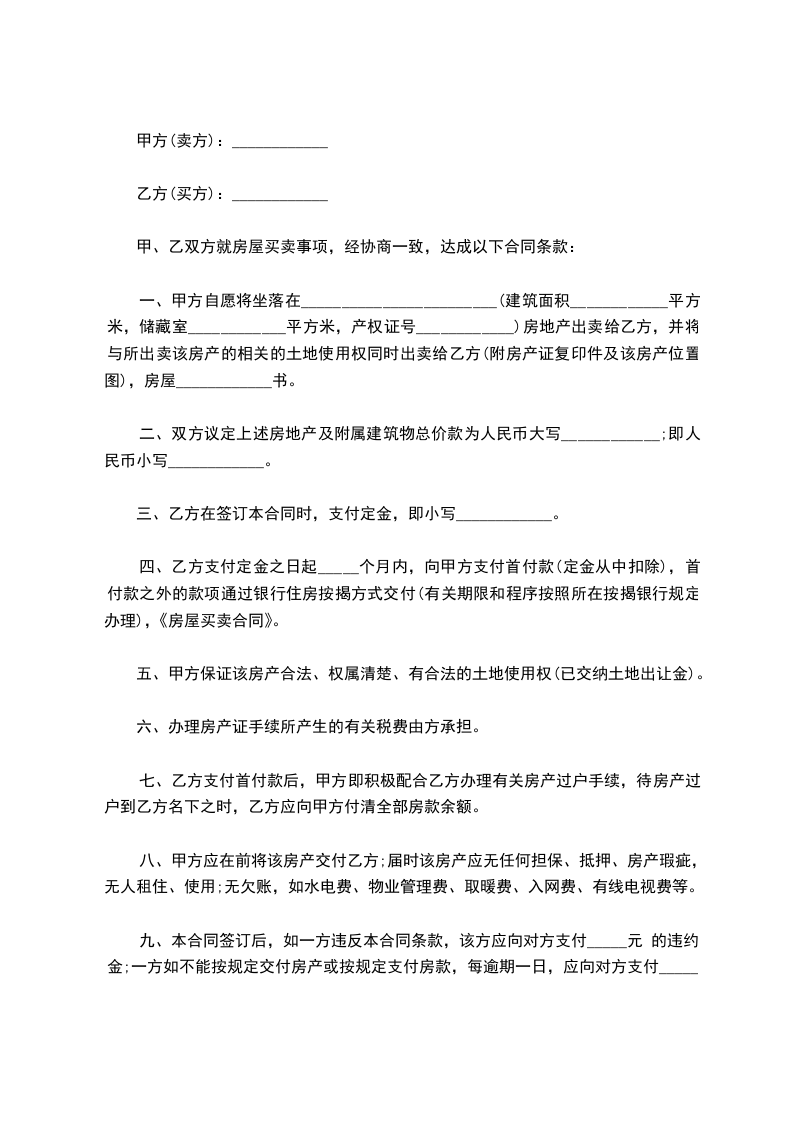 第二条上述房产的交易价格为:_________________单价:_________________人民币______________元/平方米,总价:_________________人民币_________________元整。本合同签定之日,乙方向甲方支付人民币________________元整,作为购房定金。