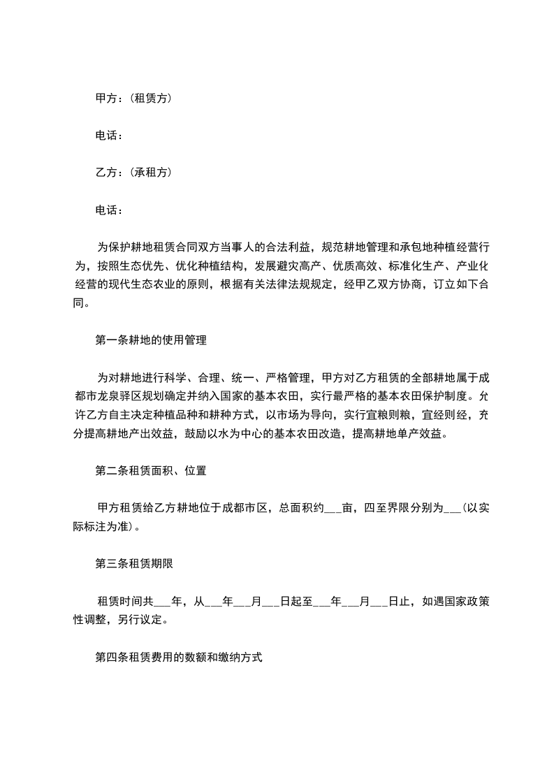 为保护耕地租赁合同双方当事人的合法利益,规范耕地管理和承包地种植经营行为,按照生态优先、优化种植结构,发展避灾高产、优质高效、标准化生产、产业化经营的现代生态农业的原则,根据有关法律法规规定,经甲乙双方协商,订立如下合同。
