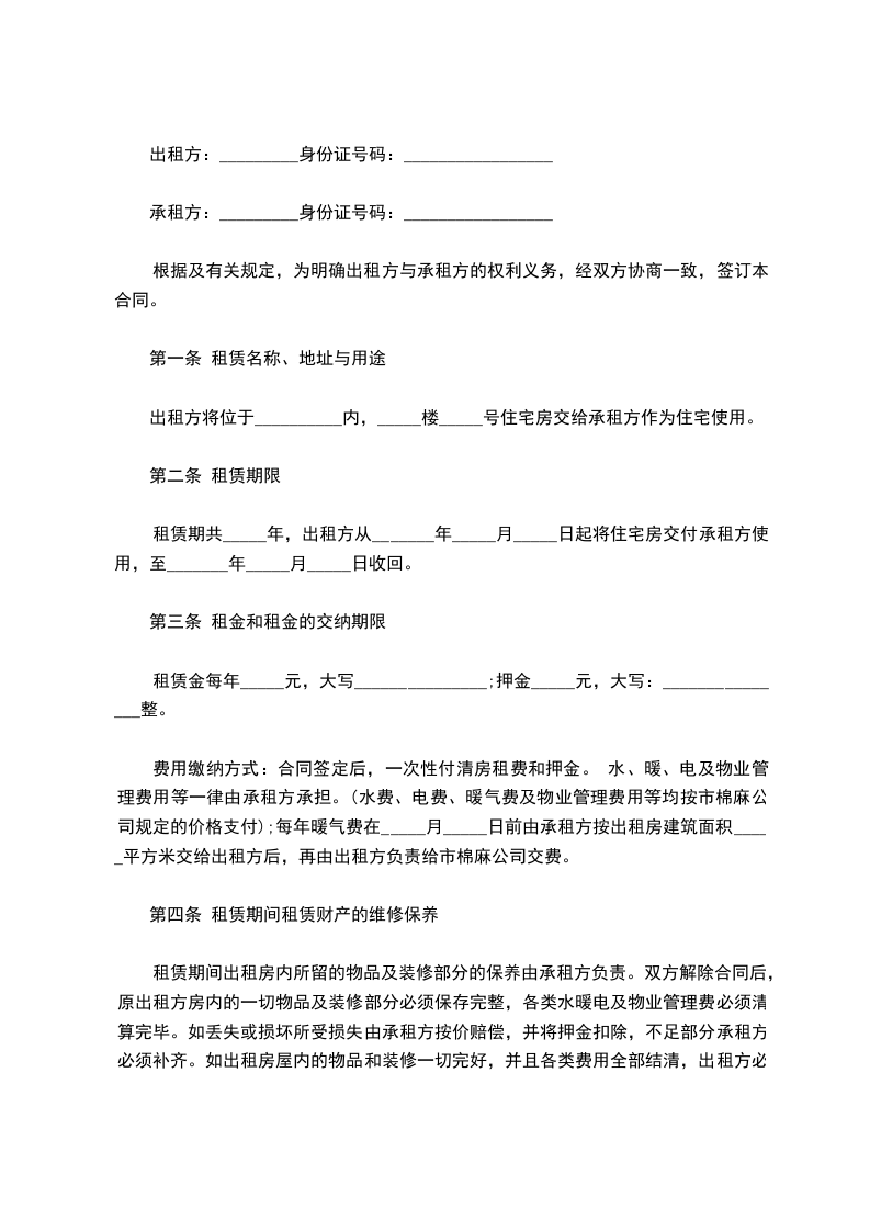 第三条:房屋租赁的期限租赁期限为___。从___年___月___日中午12时零分起至___年___月___日中午12时零。租赁期限届满前___天,如乙方需要继续承租,需要向甲方提供提出,由甲方决定是否继续续签合同。租赁期限内,如甲方出卖房屋,应提前___天通知乙方,乙方在接到通知后___天内决定是否行使优先购买权。如乙方逾期不予答复,那么视为其放弃该权利。