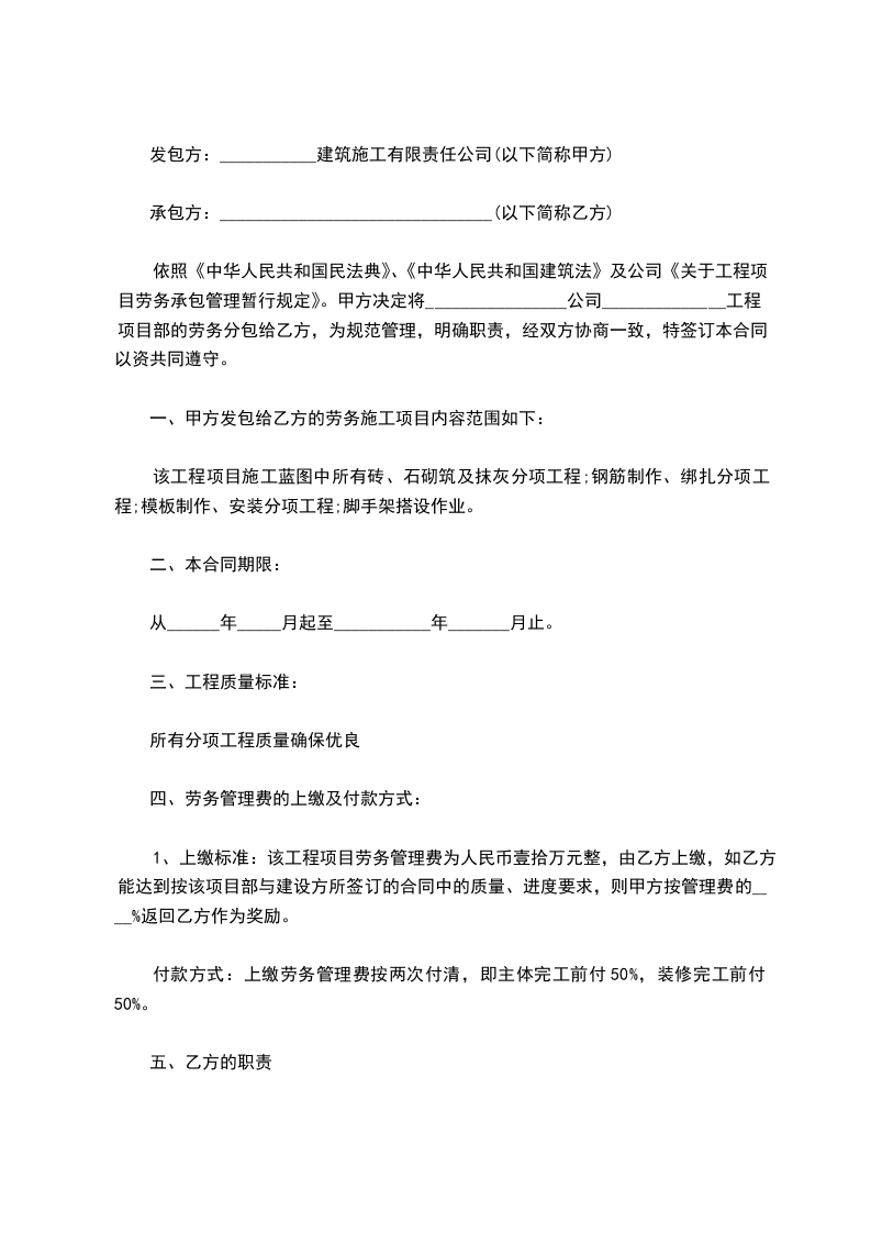 依照《中华人民共和国民法典》、《中华人民共和国建筑法》及公司《关于工程项目劳务承包管理暂行规定》。甲方决定将________________公司______________工程项目部的劳务分包给乙方,为规范管理,明确职责,经双方协商一致,特签订本合同,以资共同遵守。