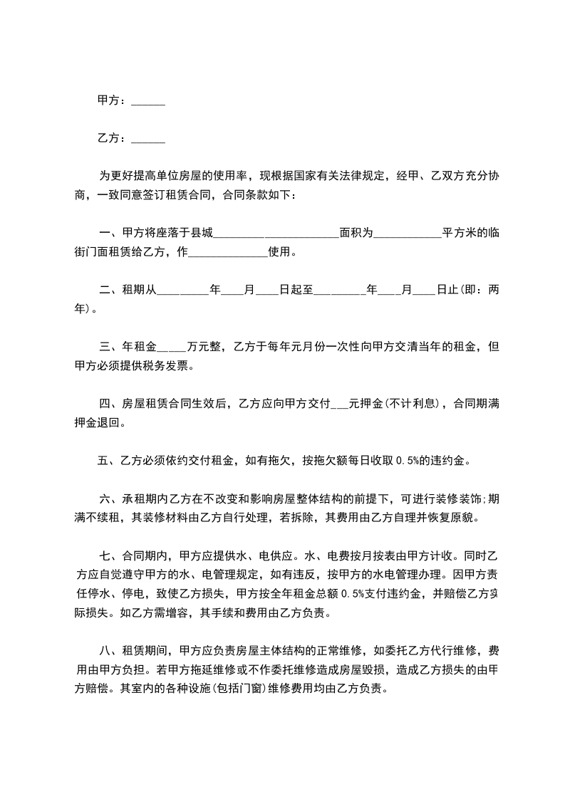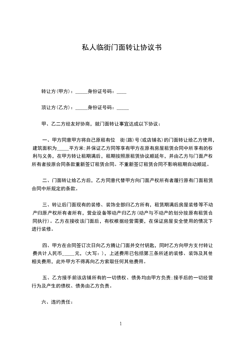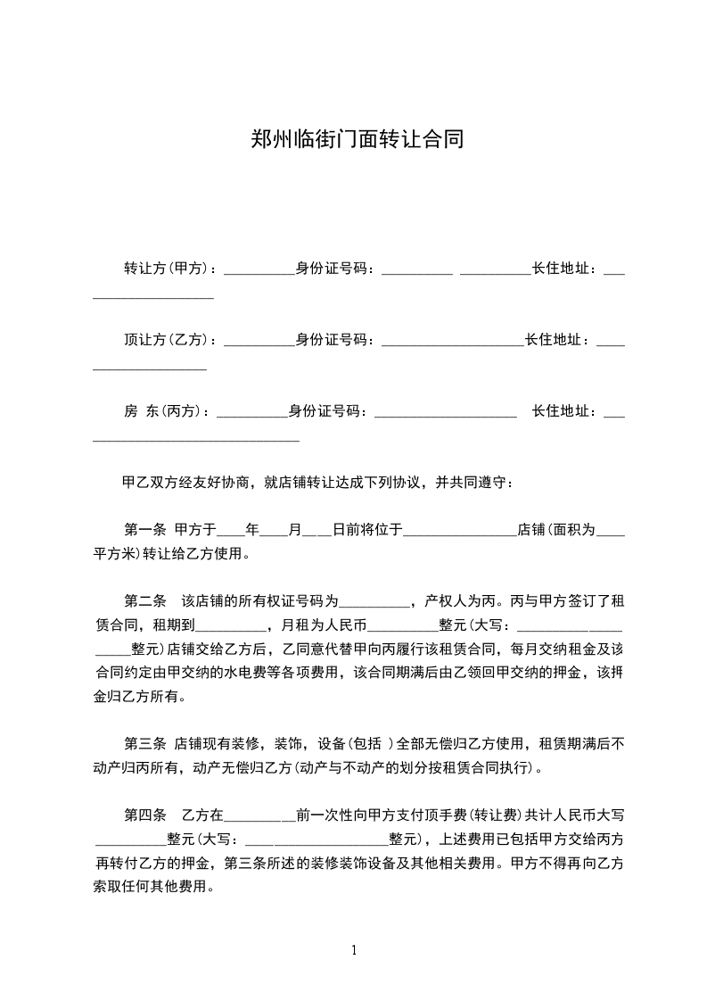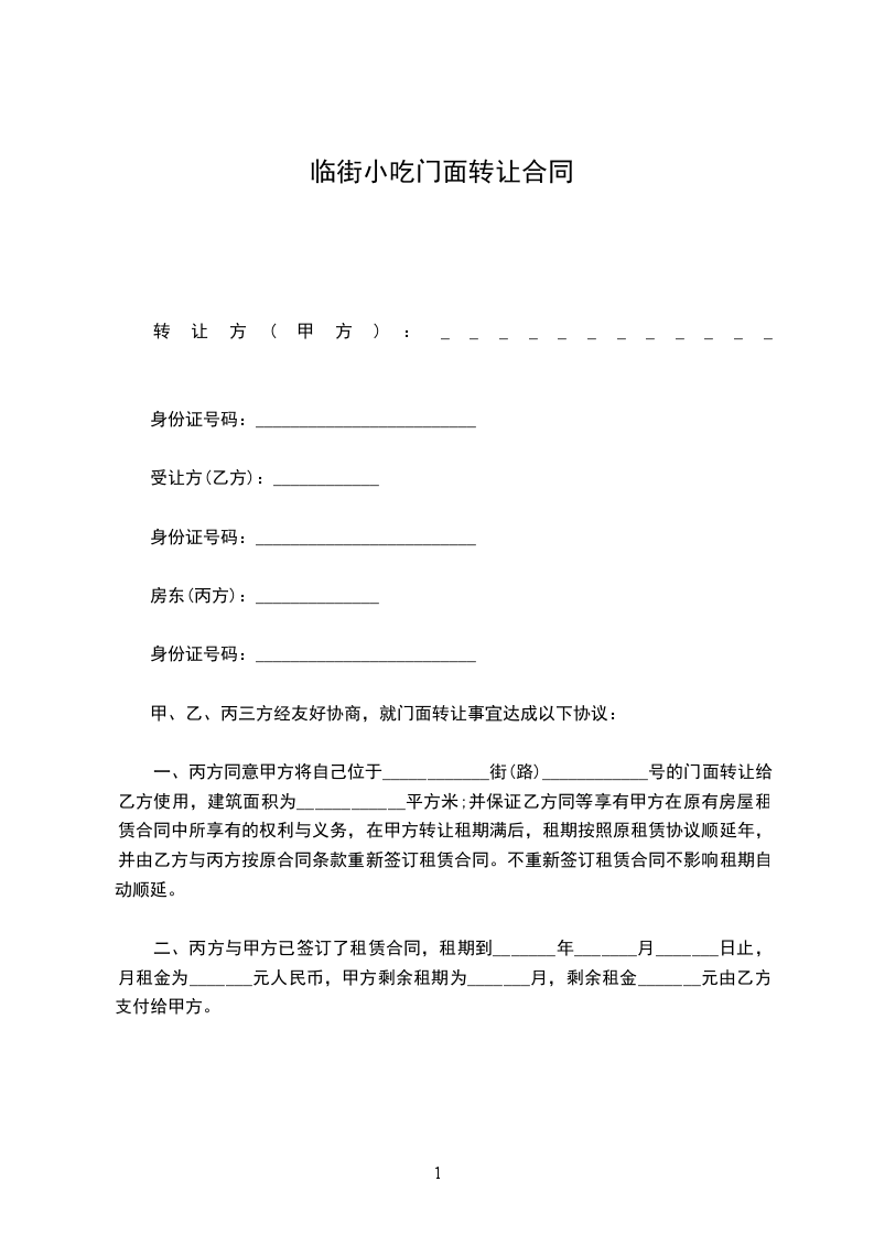 一、丙方同意甲方将自己位于____________街(路)____________号的门面转让给乙方使用,建筑面积为____________平方米;并保证乙方同等享有甲方在原有房屋租赁合同中所享有的权利与义务,在甲方转让租期满后,租期按照原租赁协议顺延年,并由乙方与丙方按原合同条款重新签订租赁合同。不重新签订租赁合同不影响租期自动顺延。