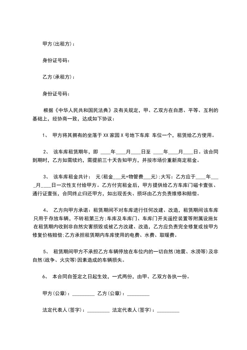 2、 该车库租赁期年,即 ____年____月____日至 ____年____月____日。该合同到期时,乙方如需续约,需提前三十天告知甲方,并按市场价重新商定租金。