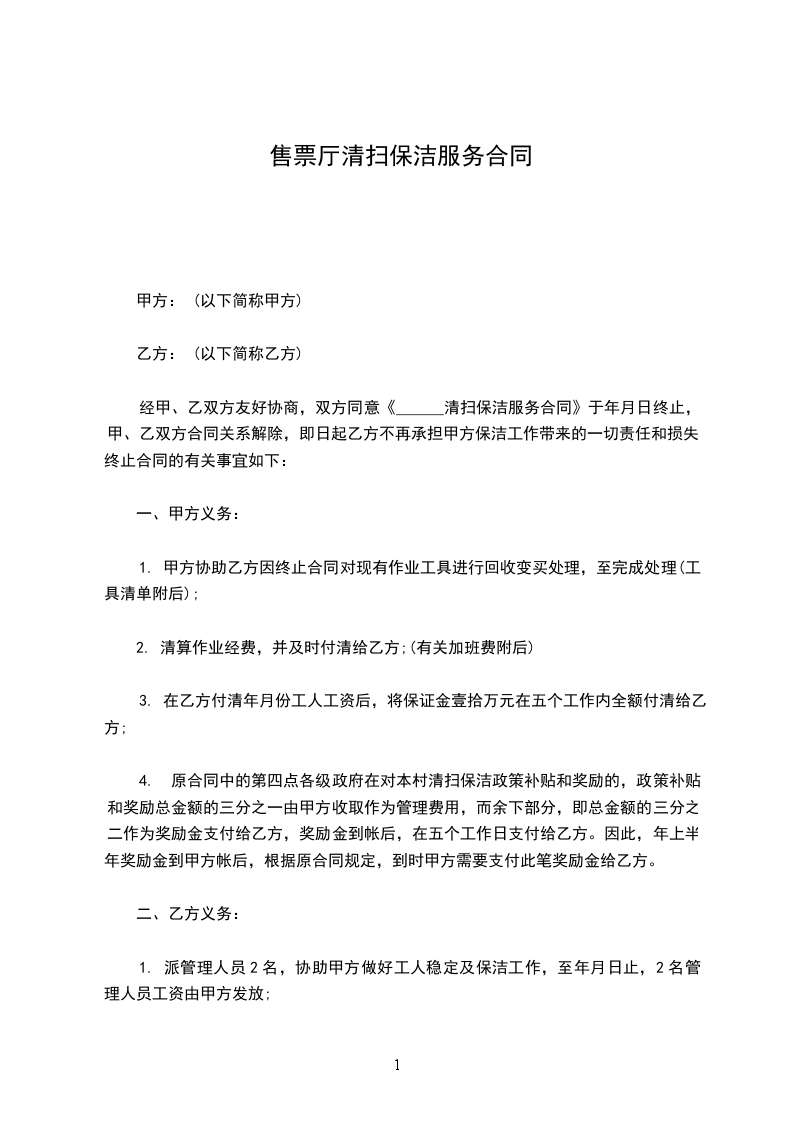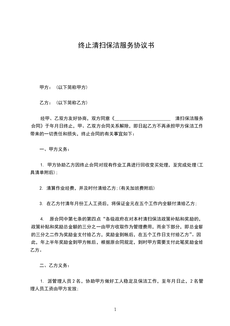 经甲、乙双方友好协商,双方同意《______清扫保洁服务合同》于_____年_____月_____日终止,甲、乙双方合同关系解除,即日起乙方不再承担甲方保洁工作带来的一切责任和损失,终止合同的有关事宜如下: