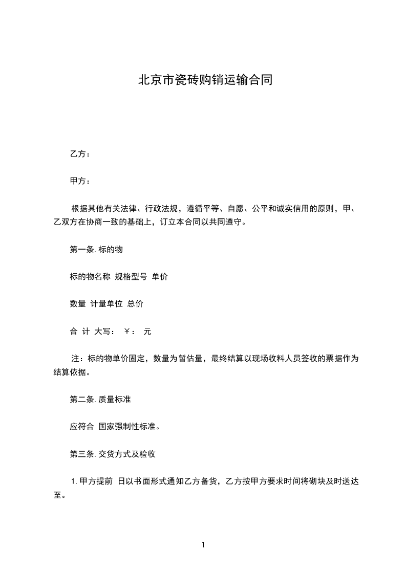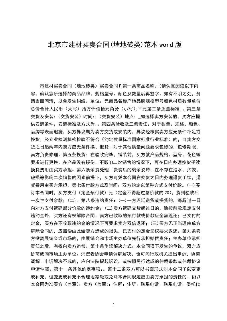 1、墙地砖经专业检测机构检测不符合国家强制性标准或合同约定质量标准的,卖方应无条件换、退货,或赔偿买方由此受到的损失;对于其他质量问题,包修期限为 年,卖方负责免费修理;