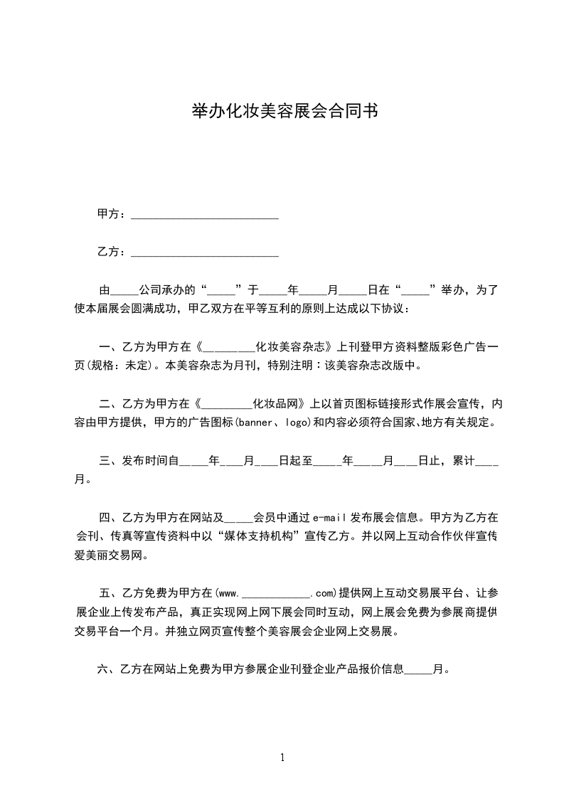 五、乙方免费为甲方在(www.____________.com)提供网上互动交易展平台、让参展企业上传发布产品,真正实现网上网下展会同时互动,网上展会免费为参展商提供交易平台一个月。并独立网页宣传整个美容展会企业网上交易展。