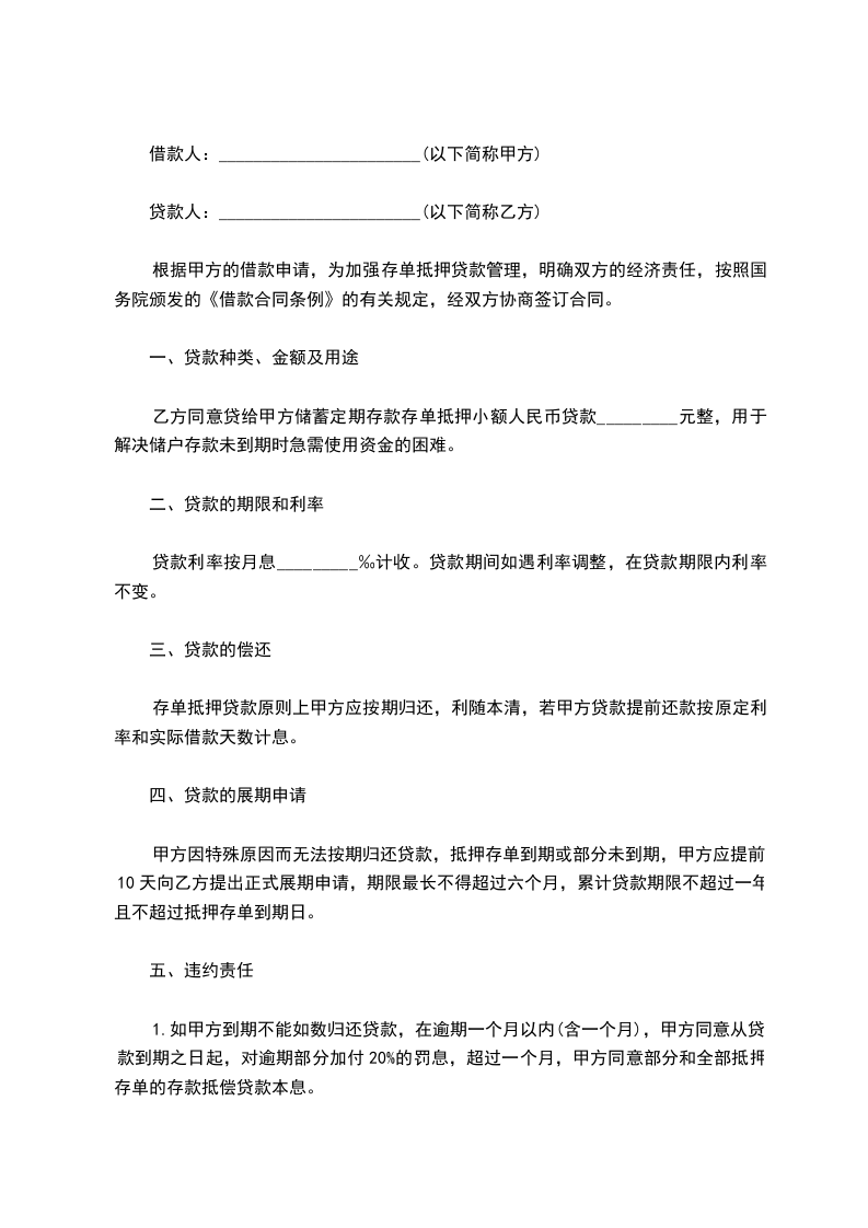 根据甲方的借款申请,为加强存单抵押贷款管理,明确双方的经济责任,按照国务院颁发的《借款合同条例》的有关规定,经双方协商签订合同。