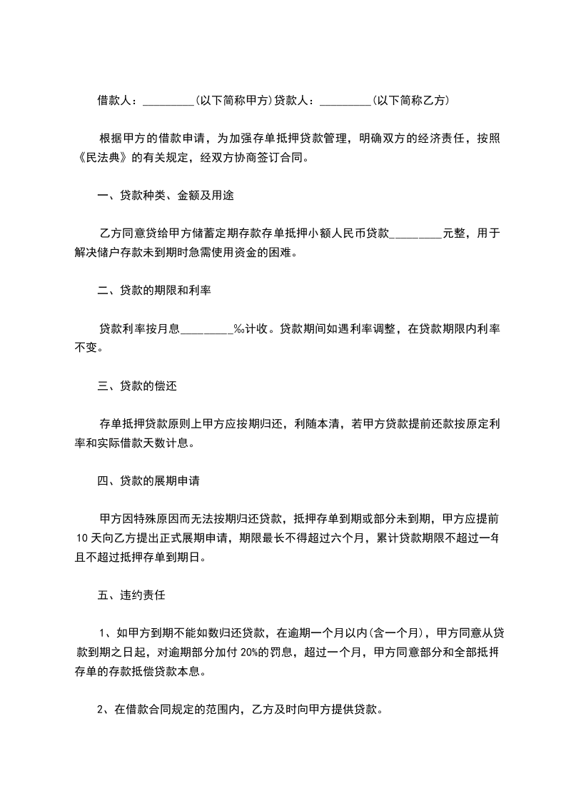 乙方同意贷给甲方储蓄定期存款存单抵押小额人民币贷款_________元整,用于解决储户存款未到期时急需使用资金的困难。