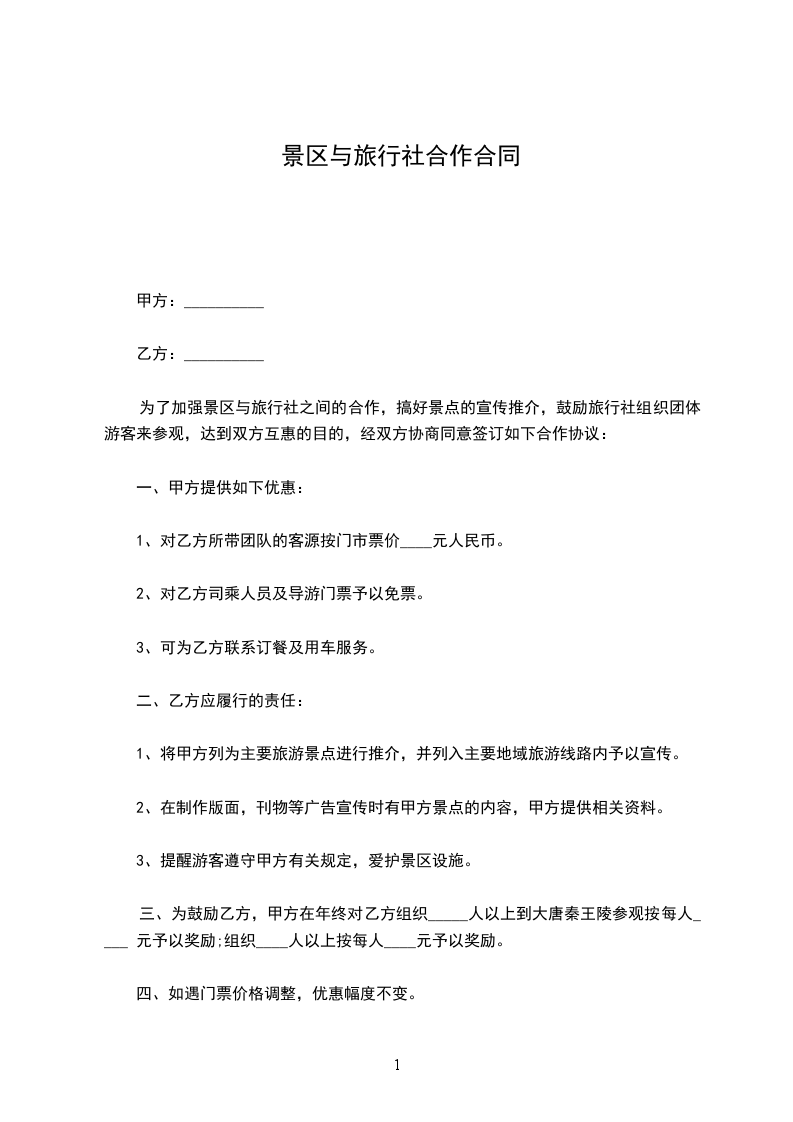 为了加强景区与旅行社之间的合作,搞好景点的宣传推介,鼓励旅行社组织团体游客来参观,达到双方互惠的目的,经双方协商同意签订如下合作协议:
