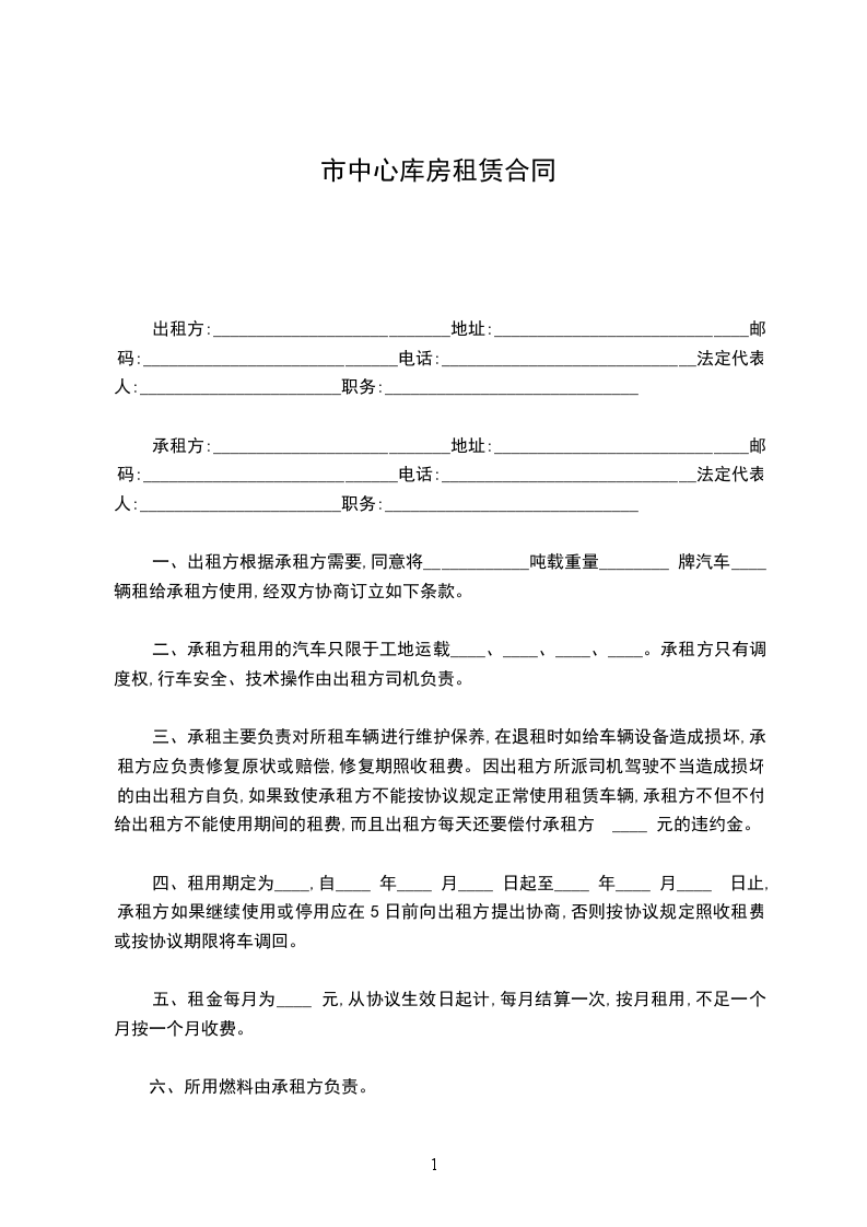 一、出租方根据承租方需要,同意将____________吨载重量________ 牌汽车____ 辆租给承租方使用,经双方协商订立如下条款。
