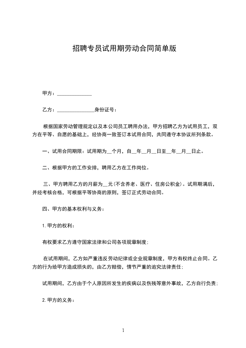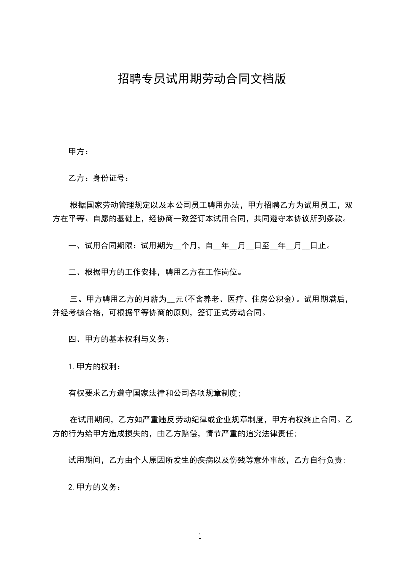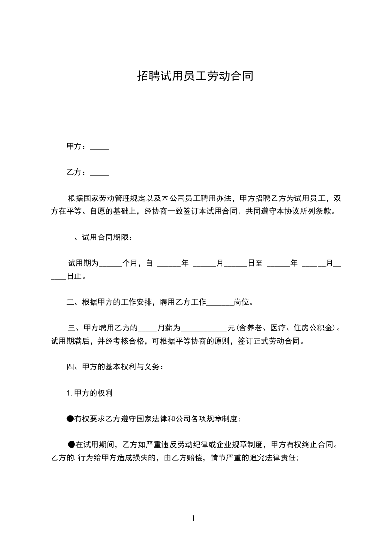 根据国家劳动管理规定以及本公司员工聘用办法,甲方招聘乙方为试用员工,双方在平等、自愿的基础上,经协商一致签订本试用合同,共同遵守本协议所列条款。