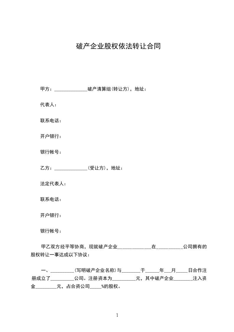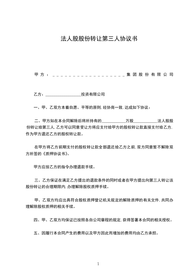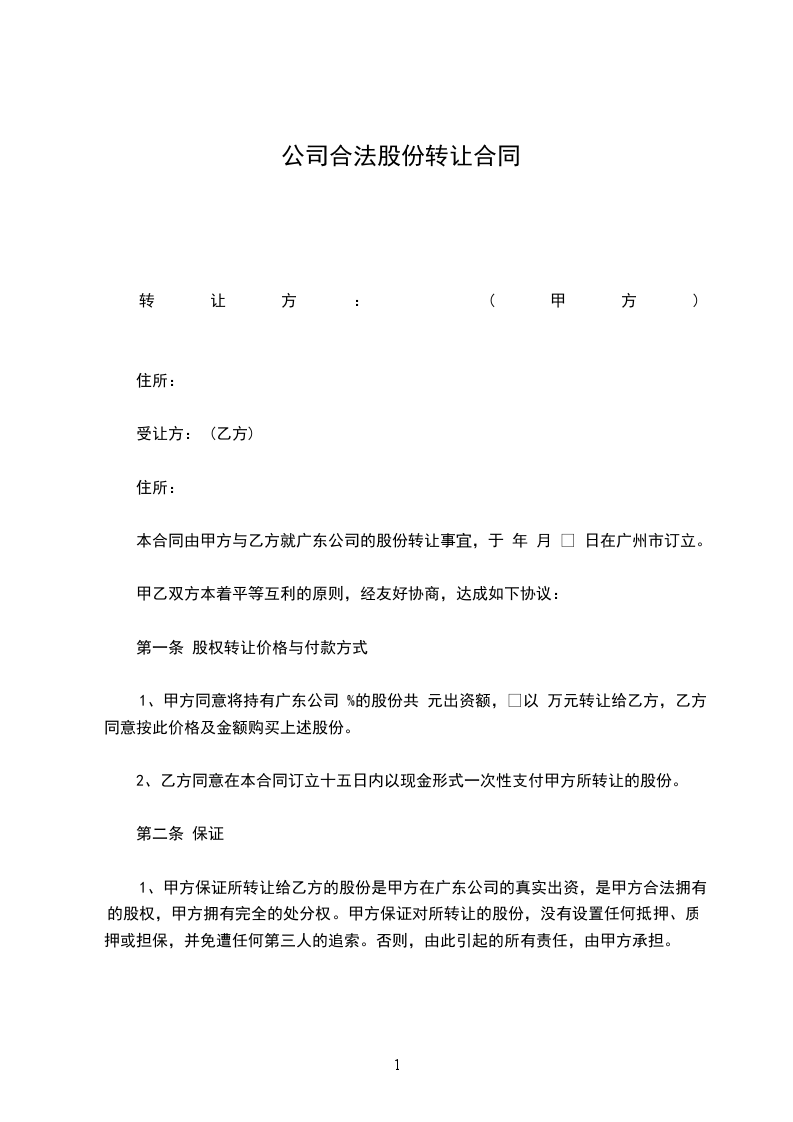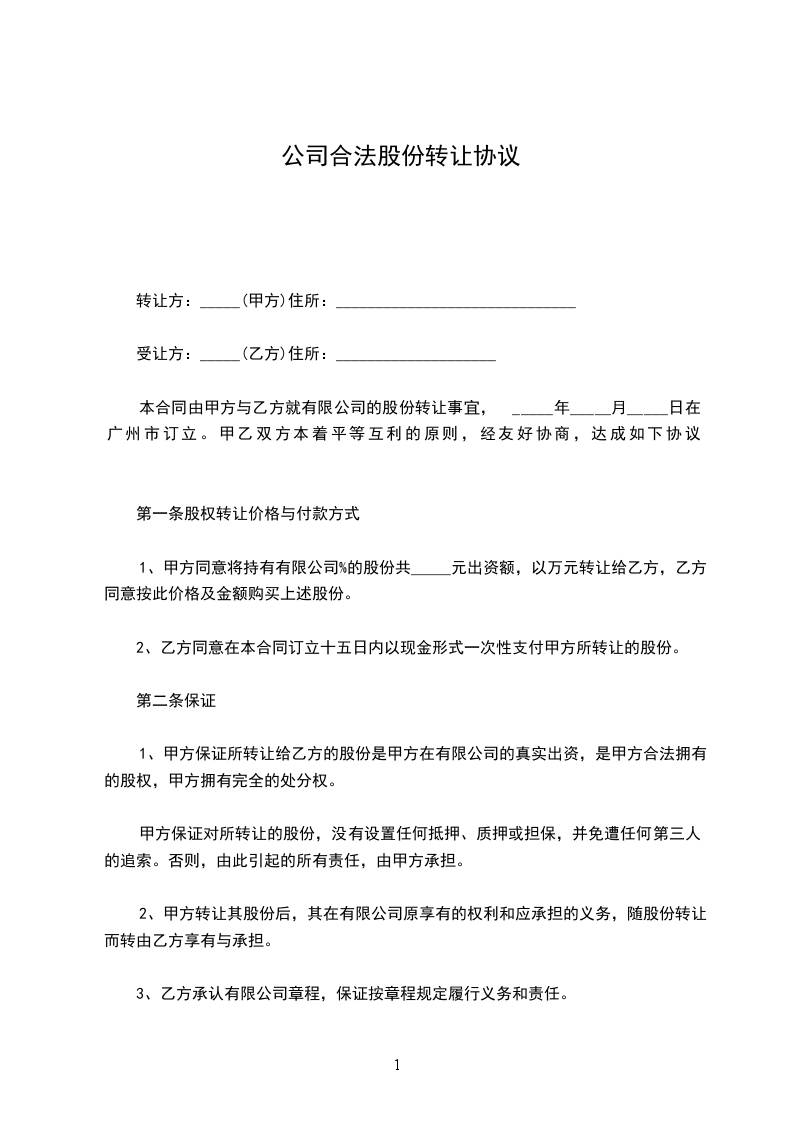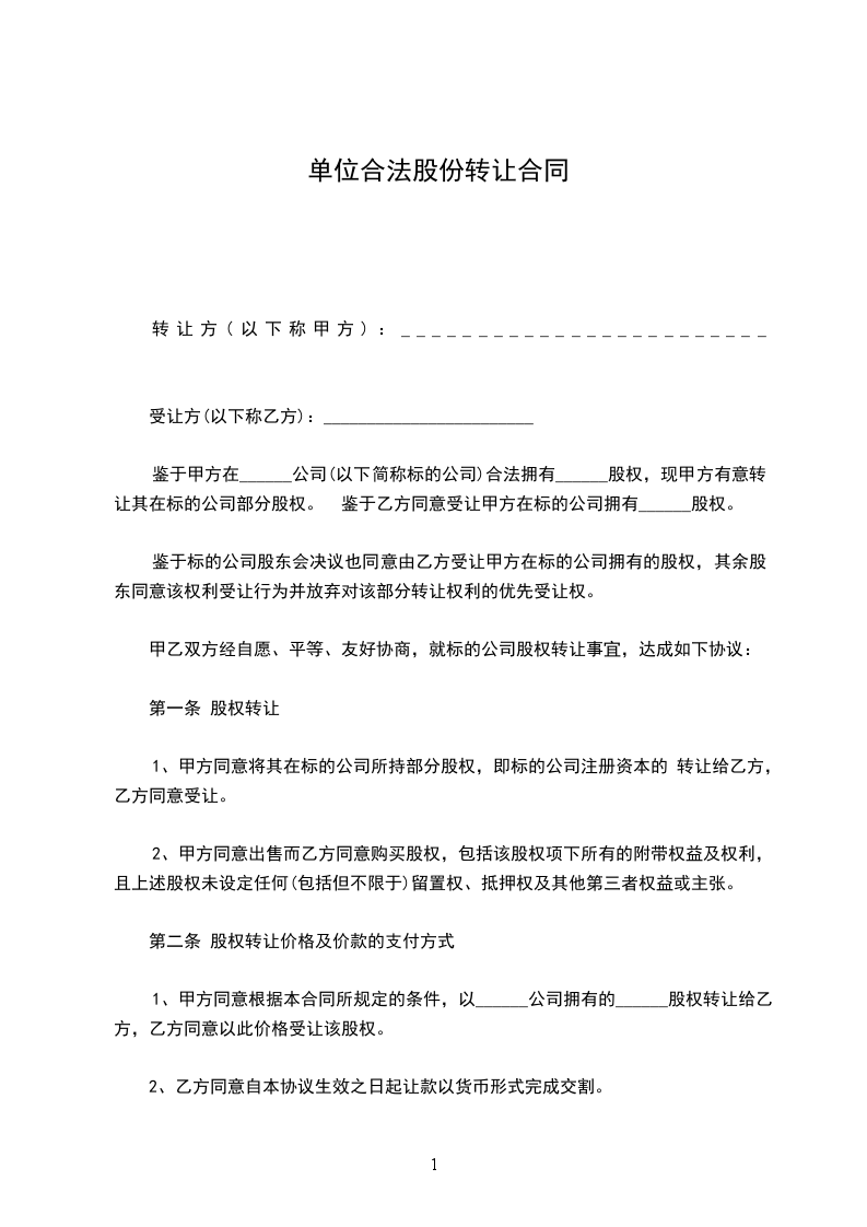 一、转让方将其在__________________公司(以下简称公司)_______%的股份(人民币_________元)依法转让给受让方。