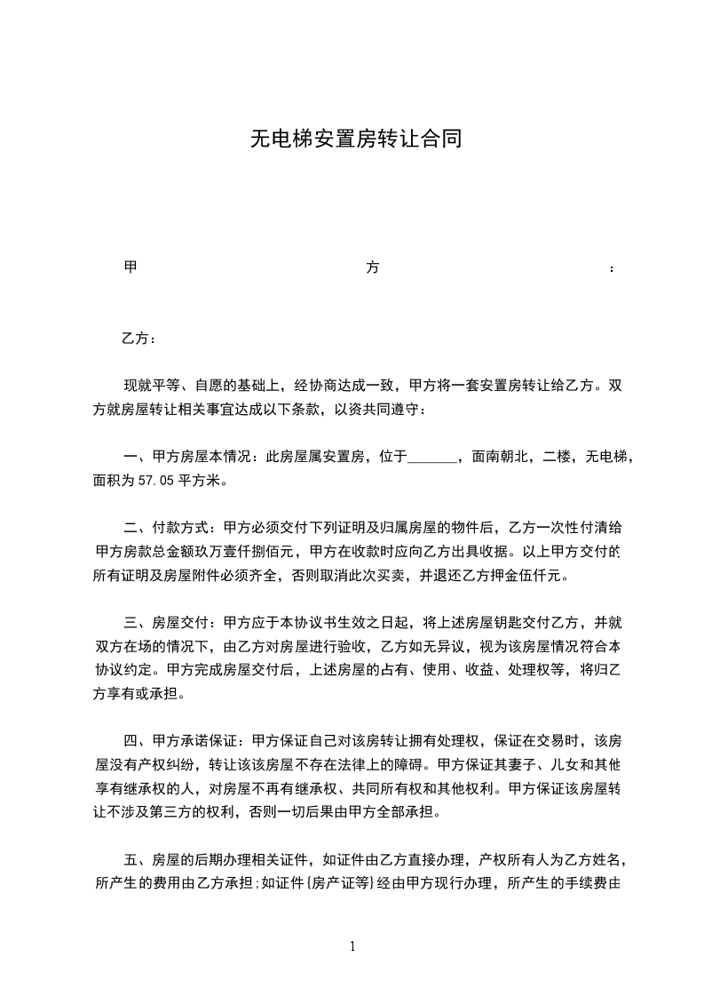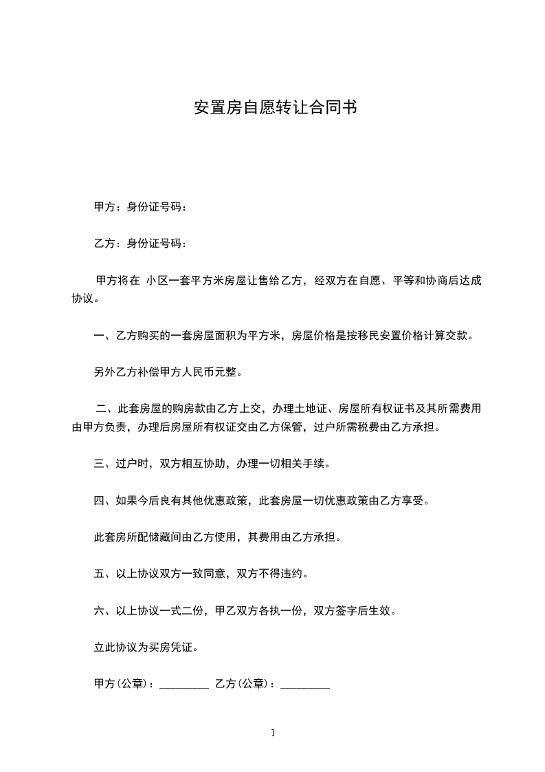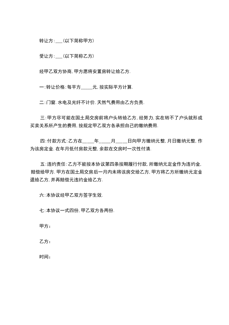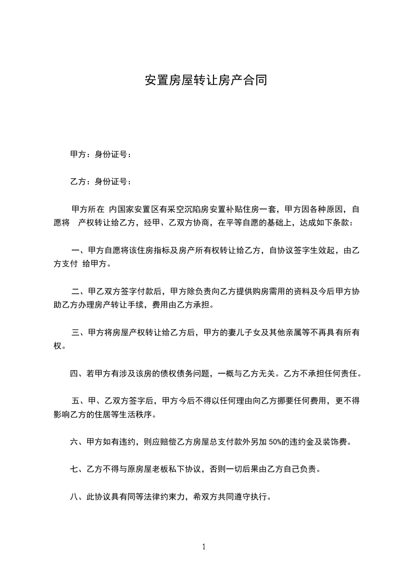 甲方所在 内国家安置区有采空沉陷房安置补贴住房一套,甲方因各种原因,自愿将 产权转让给乙方,经甲、乙双方协商,在平等自愿的基础上,达成如下条款: