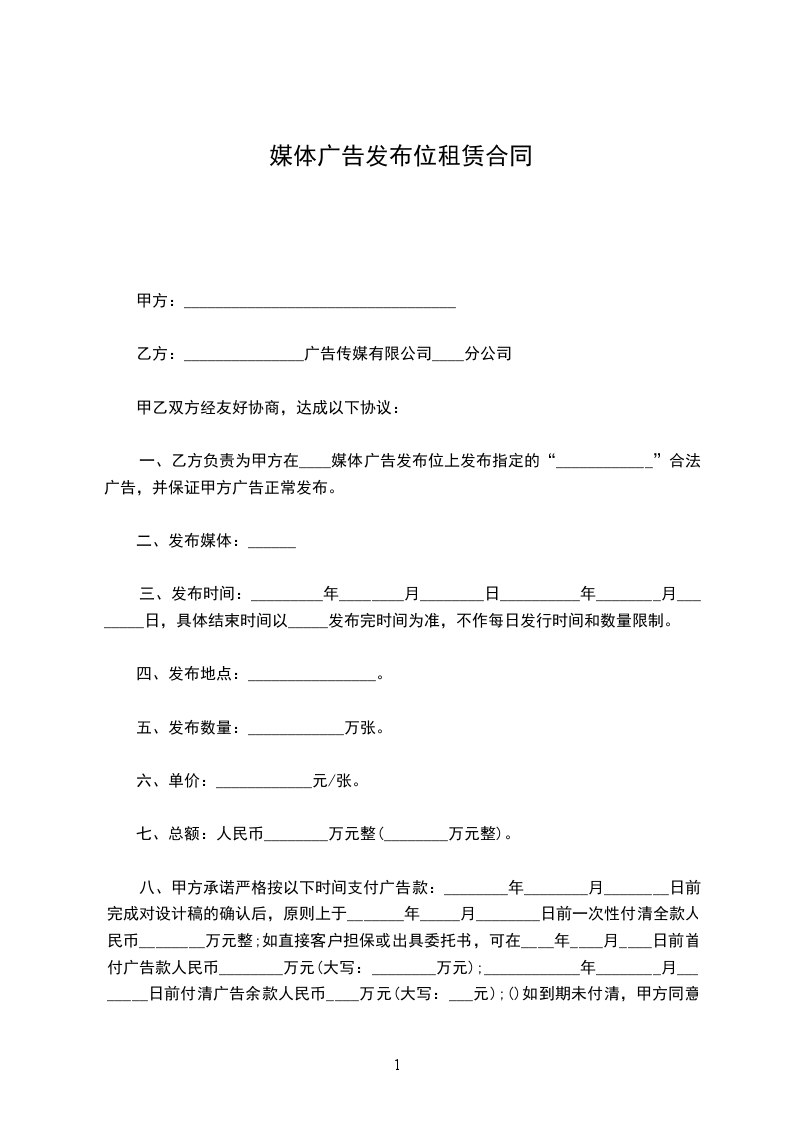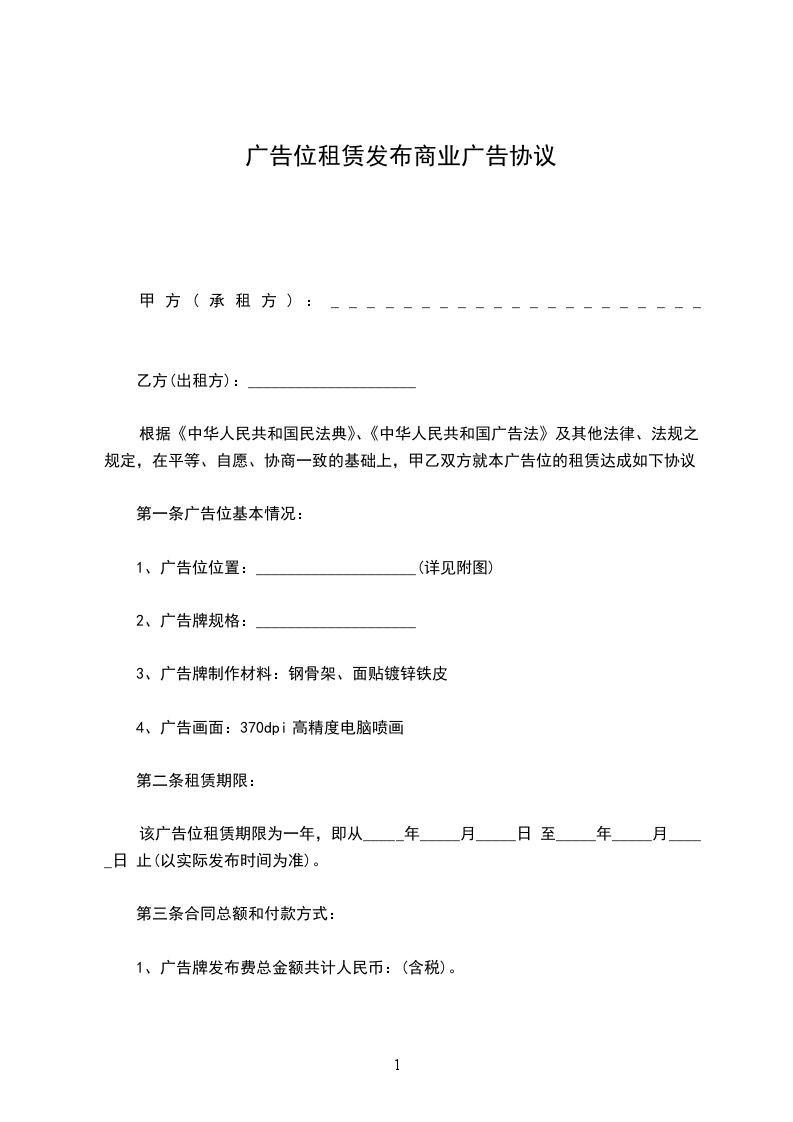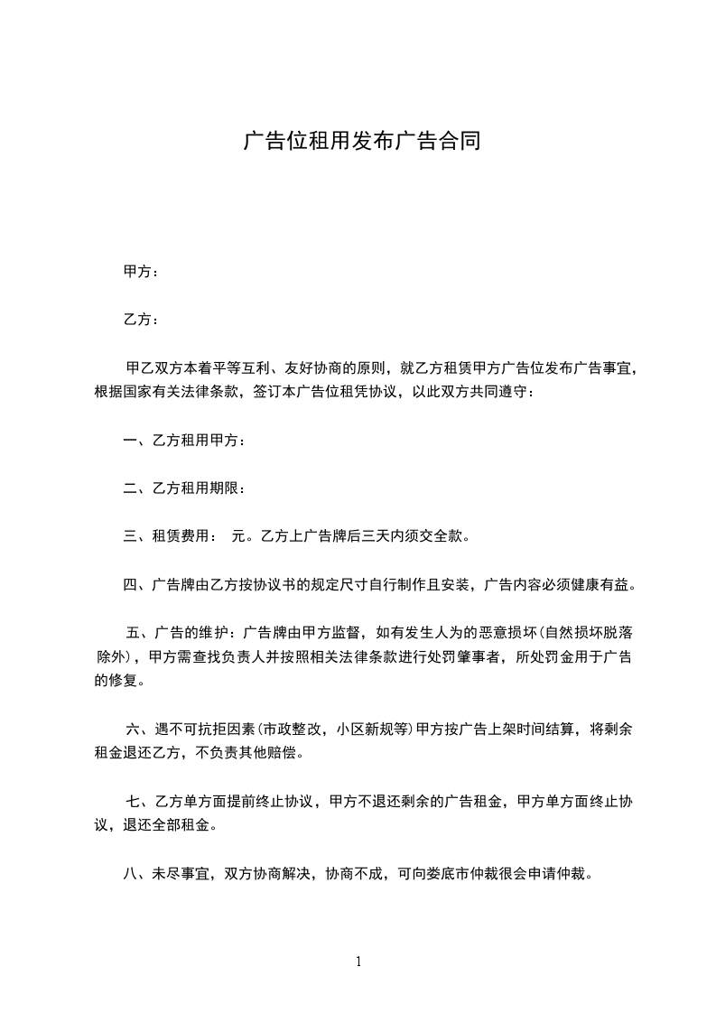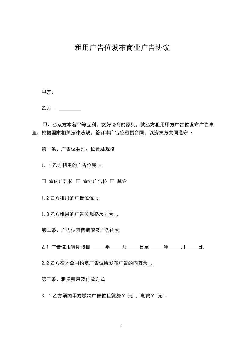 甲乙双方本着平等互利、友好协商的原则,就乙方租赁甲方广告位发布广告事宜,根据国家有关法律条款,签订本广告位租凭协议,以此双方共同遵守: