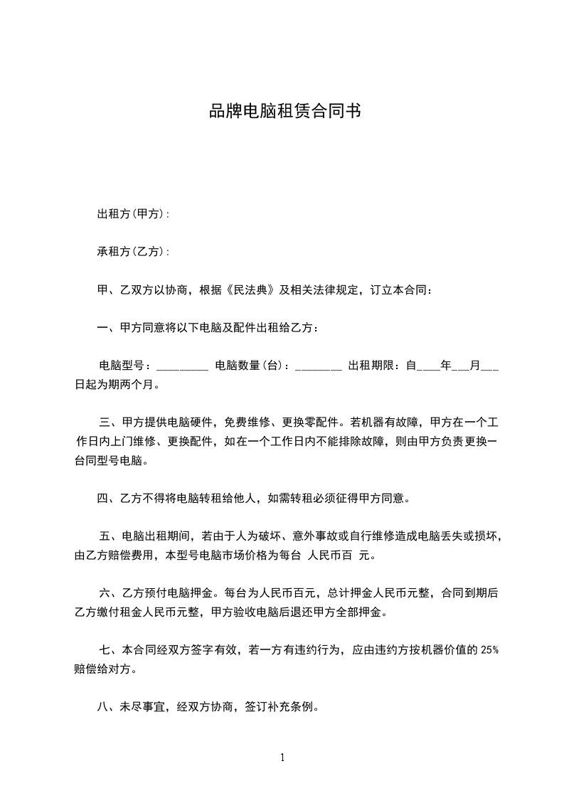 电脑型号:_________ 电脑数量(台):________ 出租期限:自____年___月___日起为期两个月。