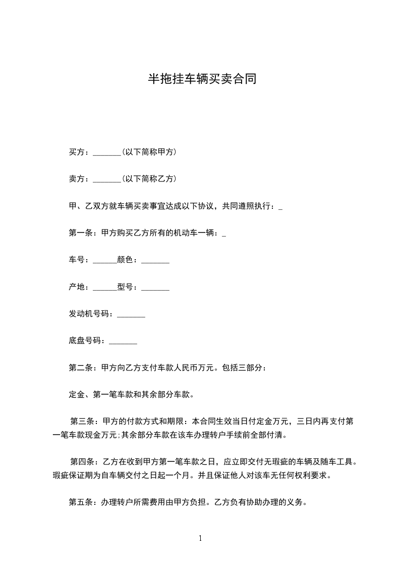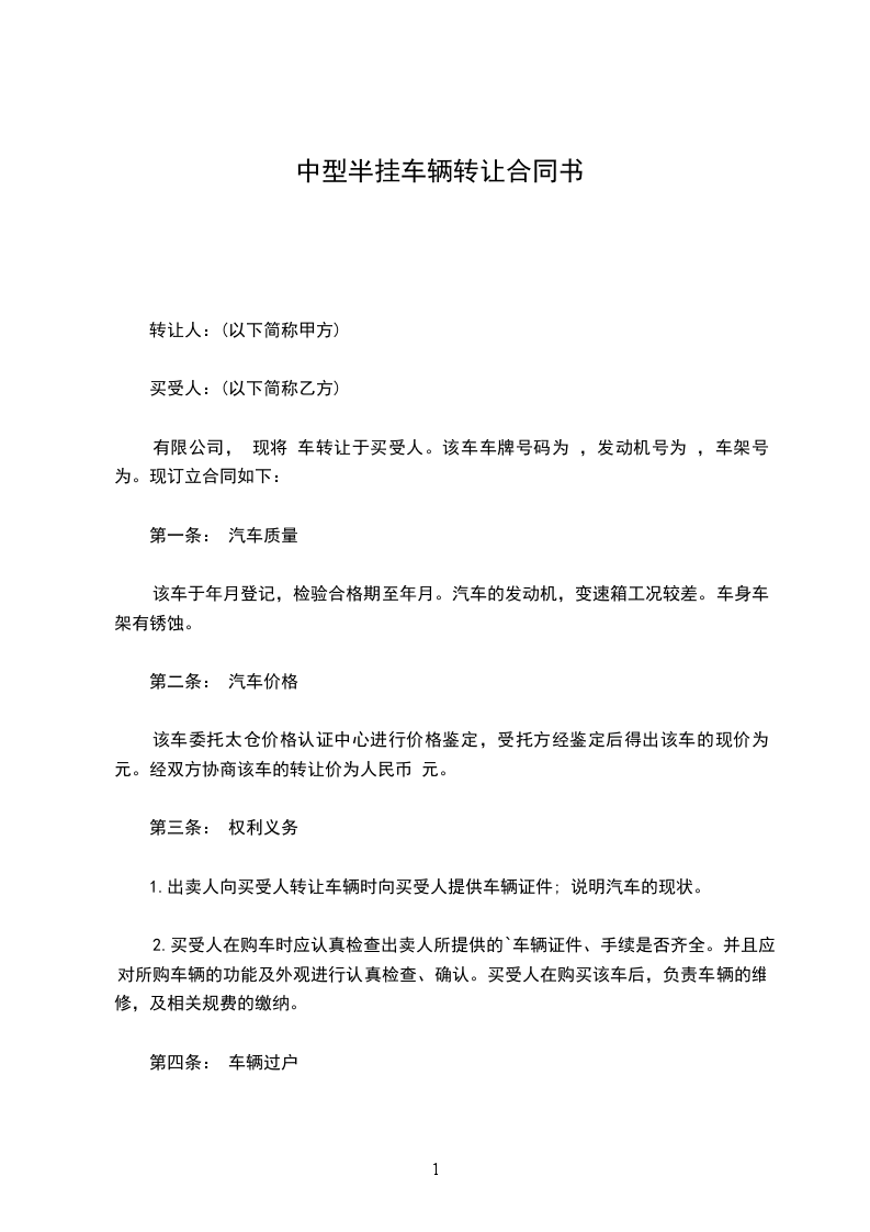 有限公司, 现将 车转让于买受人。该车车牌号码为 ,发动机号为 ,车架号为 。现订立合同如下: