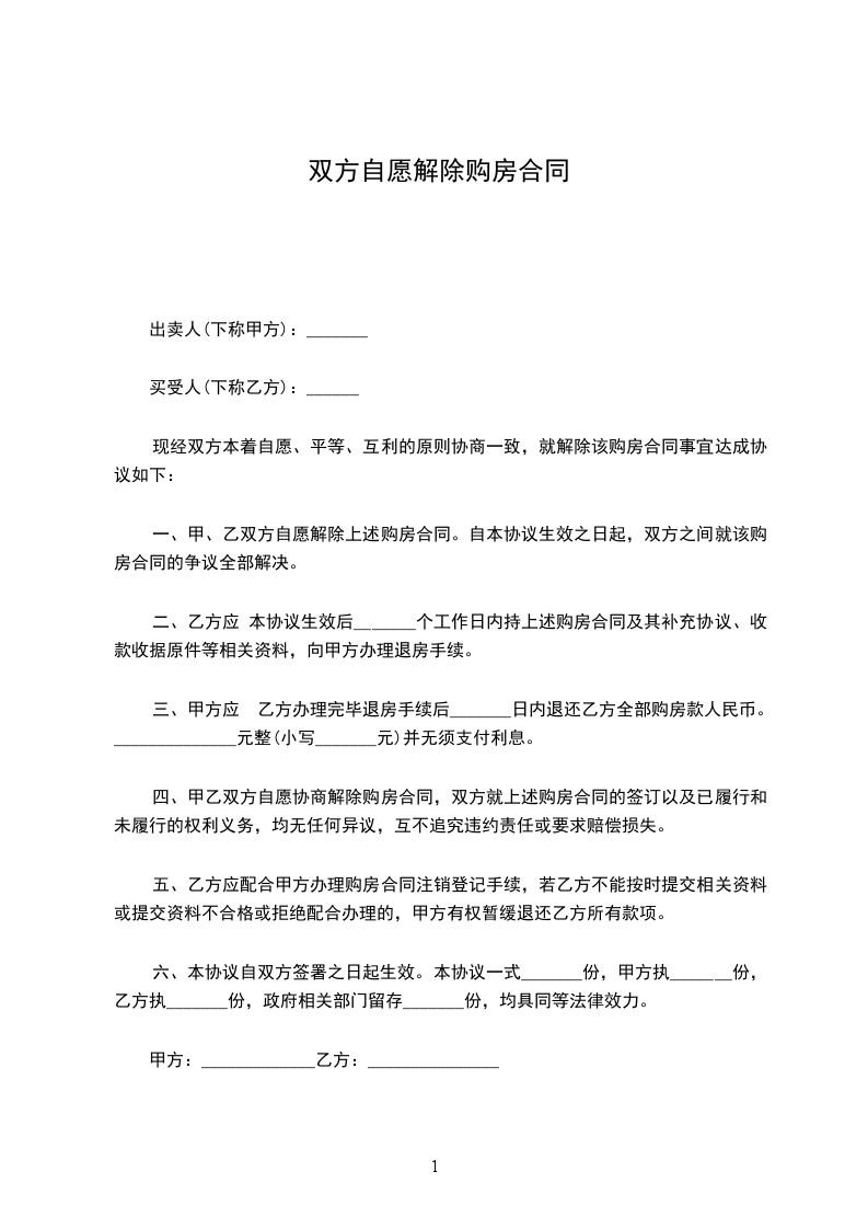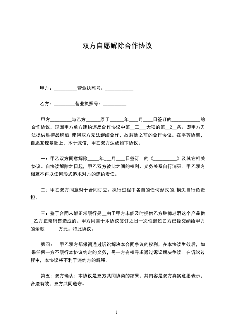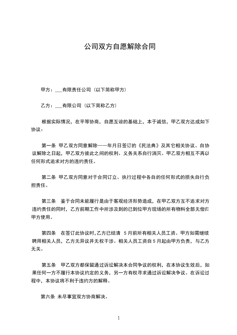 第一条 甲乙双方同意解除——_____年_____月_____日签订的《民法典》及其它相关协议。自协议解除之日起,甲乙双方彼此之间的权利、义务关系自行消灭。甲乙双方相互不再以任何形式追求对方的违约责任。