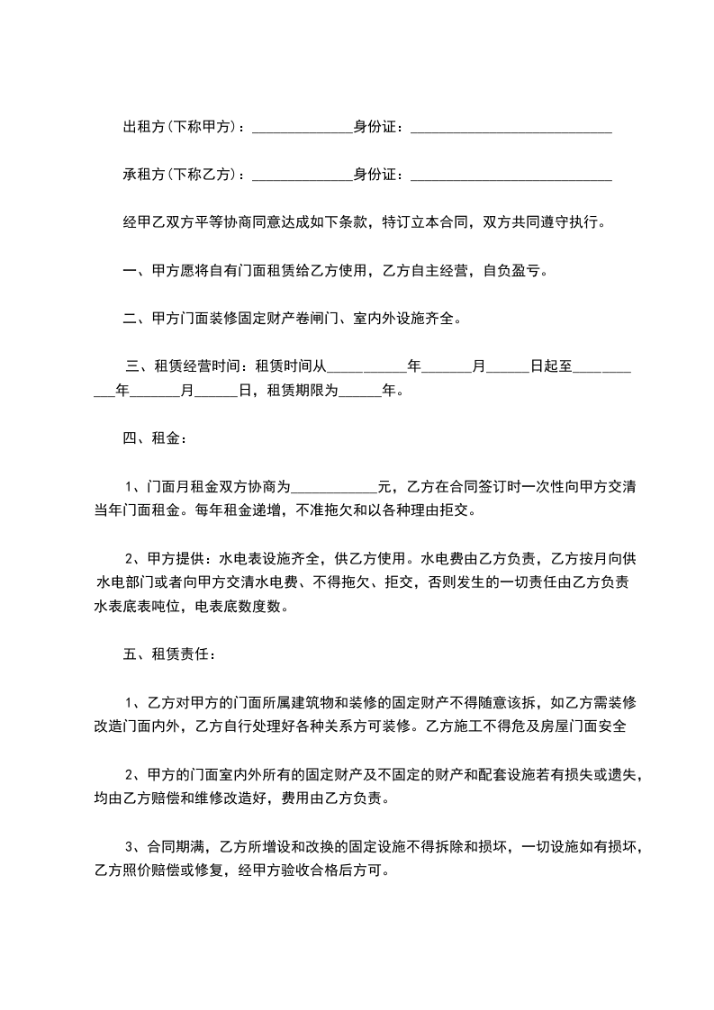 1、门面月租金双方协商为____________元,乙方在合同签订时一次性向甲方交清当年门面租金。每年租金递增,不准拖欠和以各种理由拒交。