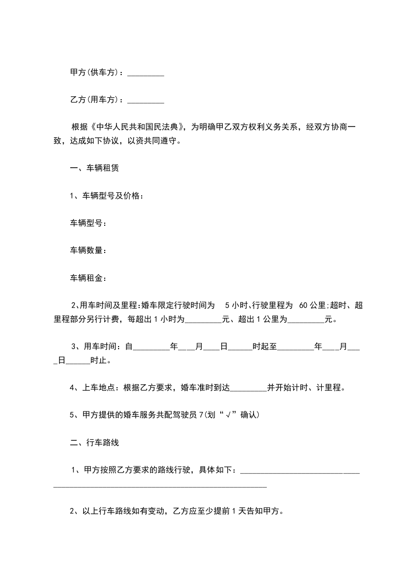 经乙方委托,我定于 年 月 日 ,向乙方提供婚礼用车服务,为了确保工作顺利进行,经甲乙双方友好协商达成以下共识,服务项目如下: