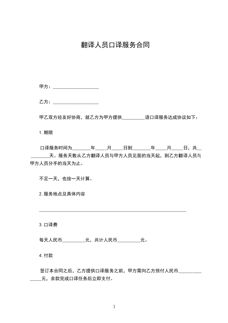 签订本合同之后,乙方提供口译服务之前,甲方需向乙方预付人民币_______________元,余款完成口译任务后立即支付。