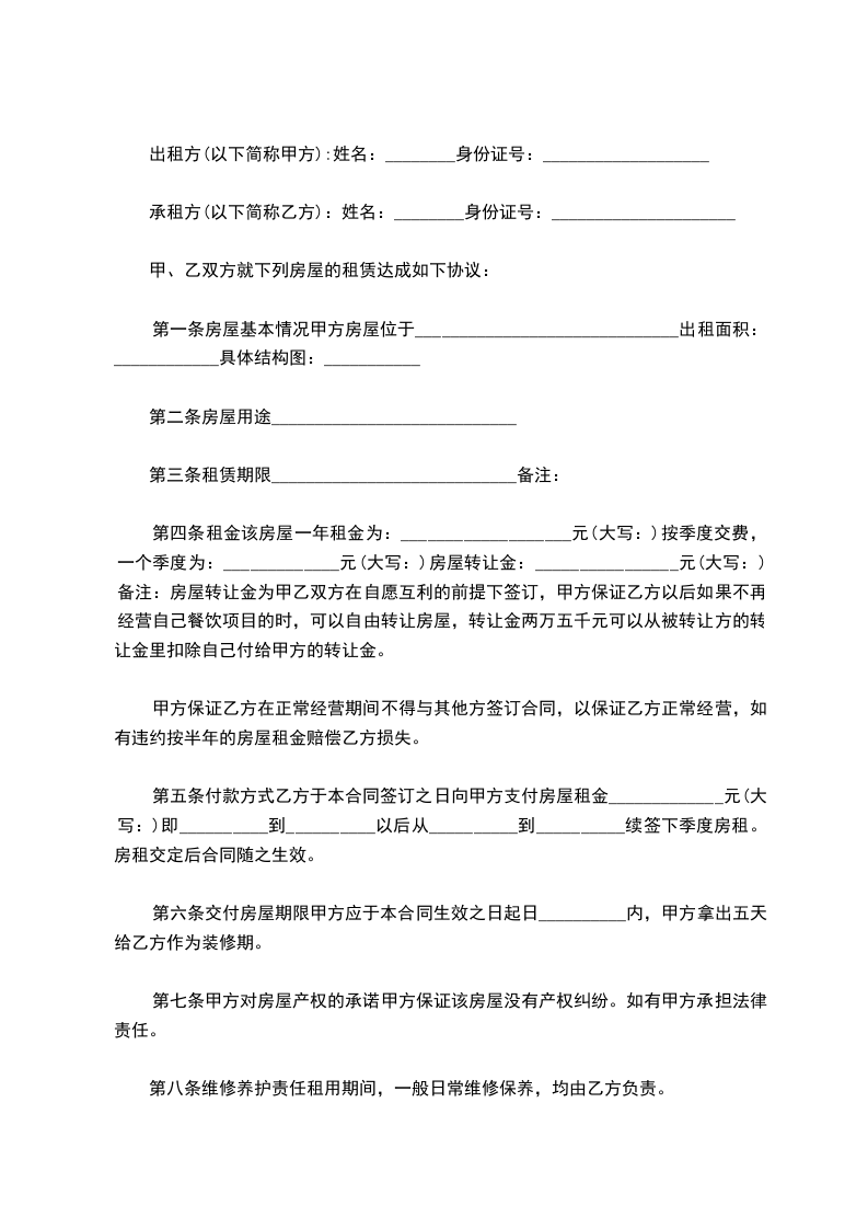 1、该房屋租金为每月人民币(大写) 元(小写) 元。