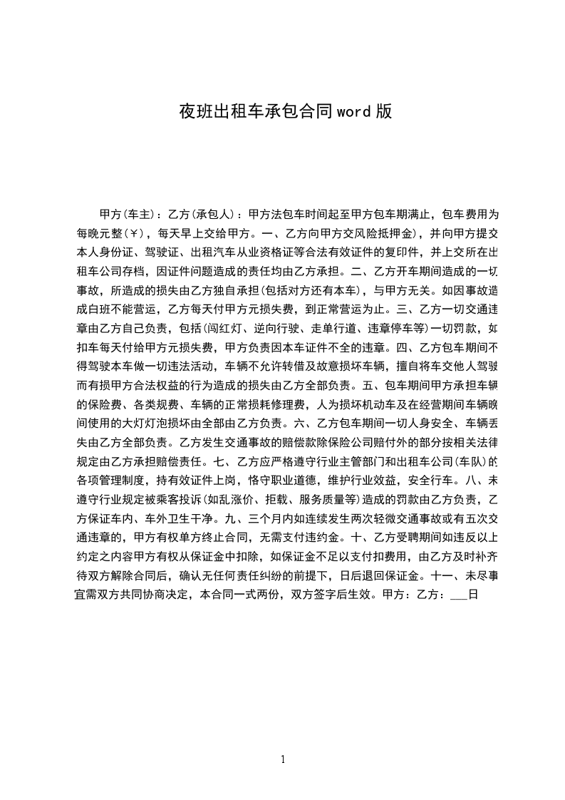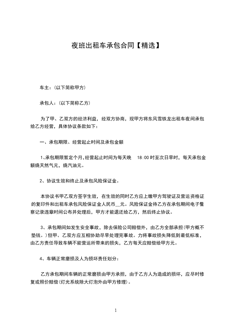 四、乙方在夜班承租期内如发生交通违章、交通事故或其他不可预见性的情况,由乙方负责承担相应的法律责任及全部损失并承担给甲方造成的损失。