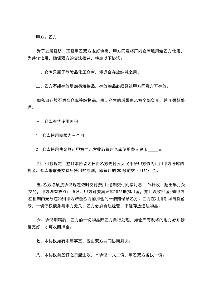 为了发展经济,现经甲乙双方友好协商,甲方同意将厂内仓库租用给乙方使用,为共守信用,确保双方的合法权益,特定以下协议: