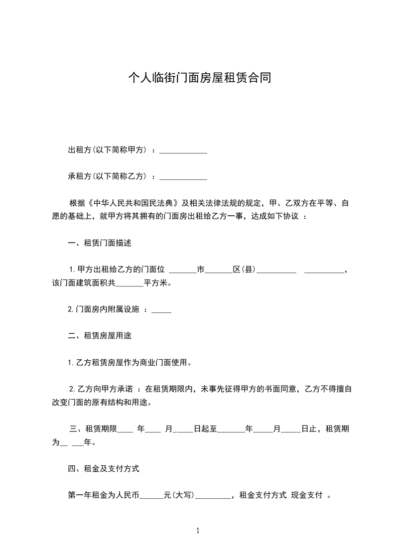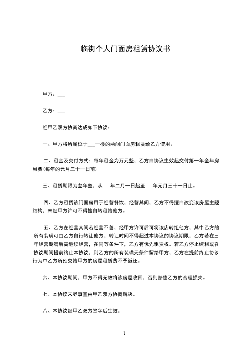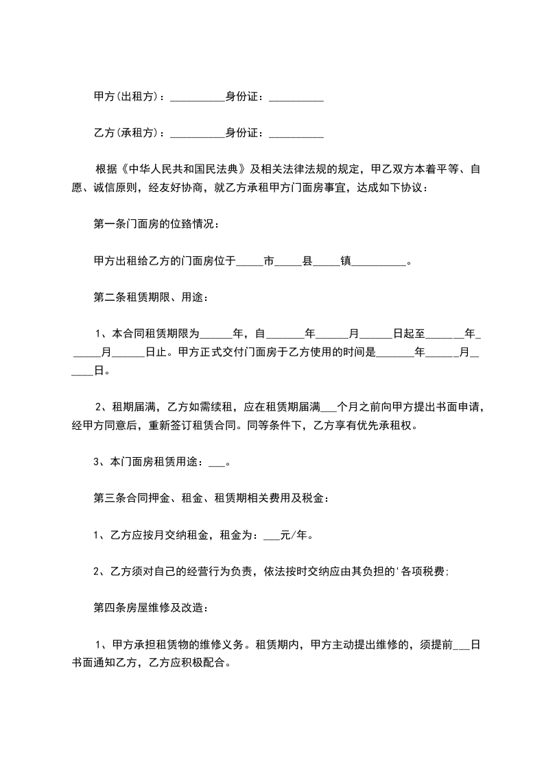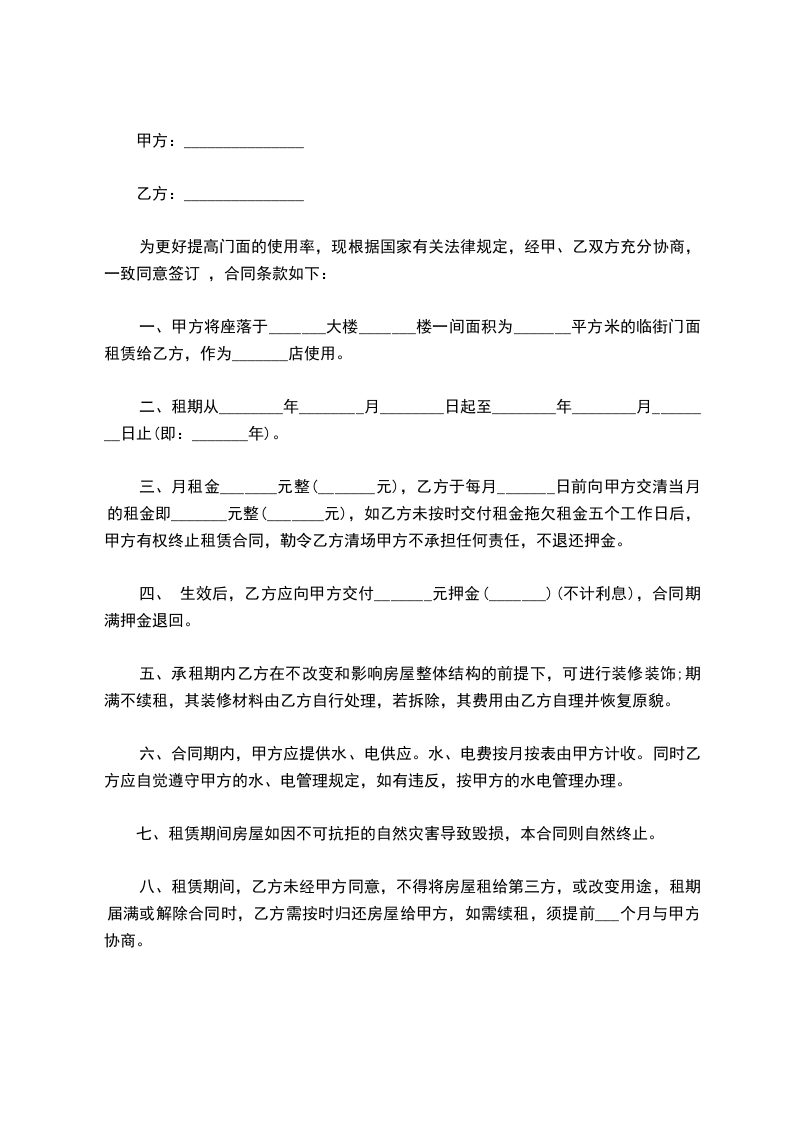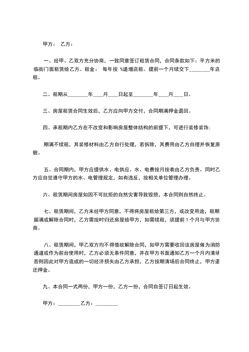 一、经甲、乙双方充分协商,一致同意签订租赁合同,合同条款如下:平方米的临街门面租赁给乙方。租金: 每年按 %递增店租。提前一个月续交下________年店租。