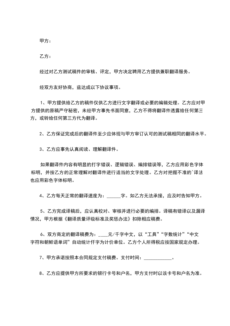 经过对乙方测试稿件的审核、评定,甲方决定聘用乙方提供兼职翻译服务。